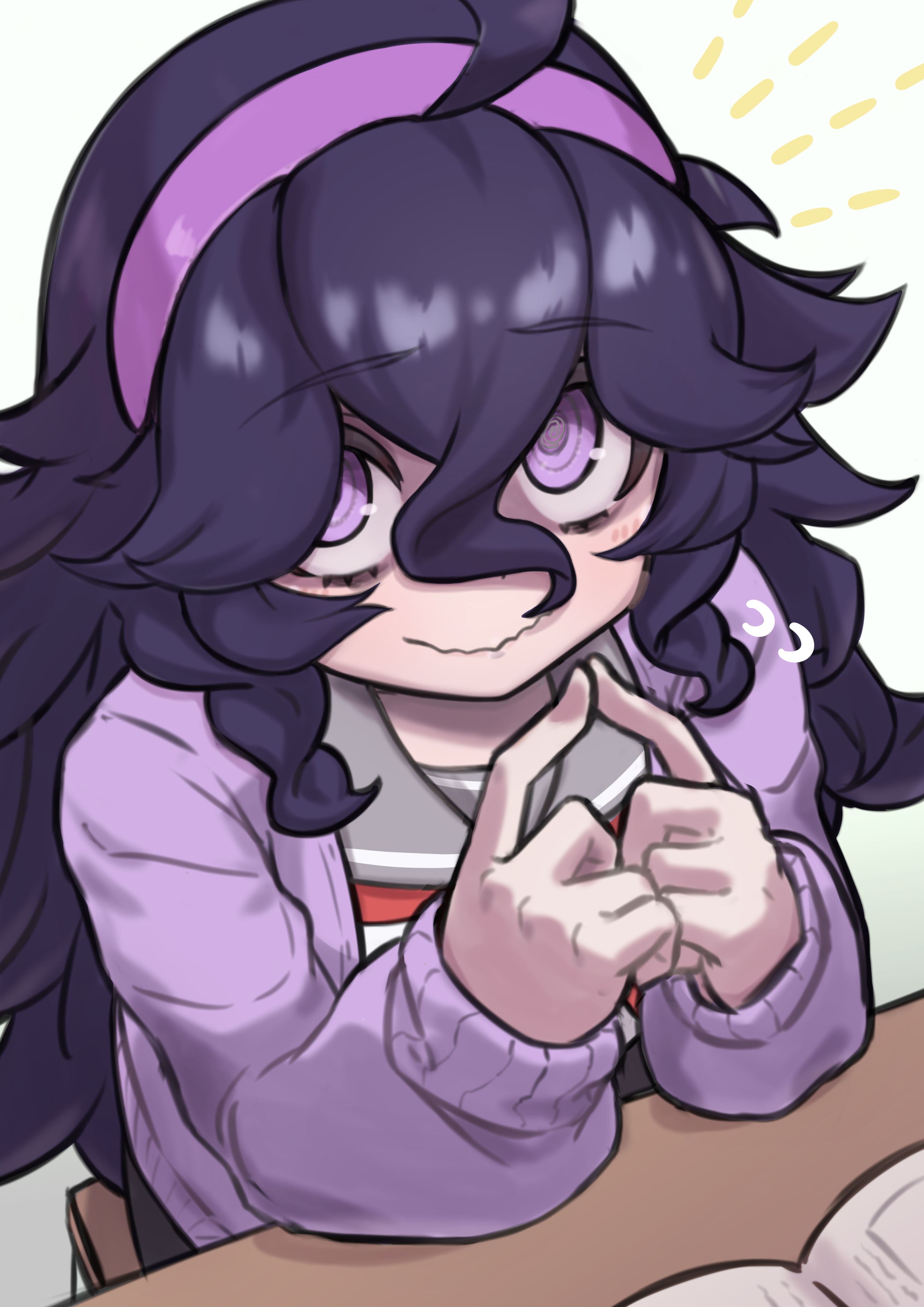 @_@ absurdres alternate_costume bags_under_eyes black_hair book commentary_request desk elbows_on_table hair_between_eyes hairband hex_maniac_(pokemon) hex_maniac_(pokemon_xy) highres index_fingers_together jaguarsee long_hair looking_at_viewer messy_hair nintendo open_book pokemon pokemon_xy purple_eyes purple_hairband purple_sweater sidelocks sweater wavy_mouth