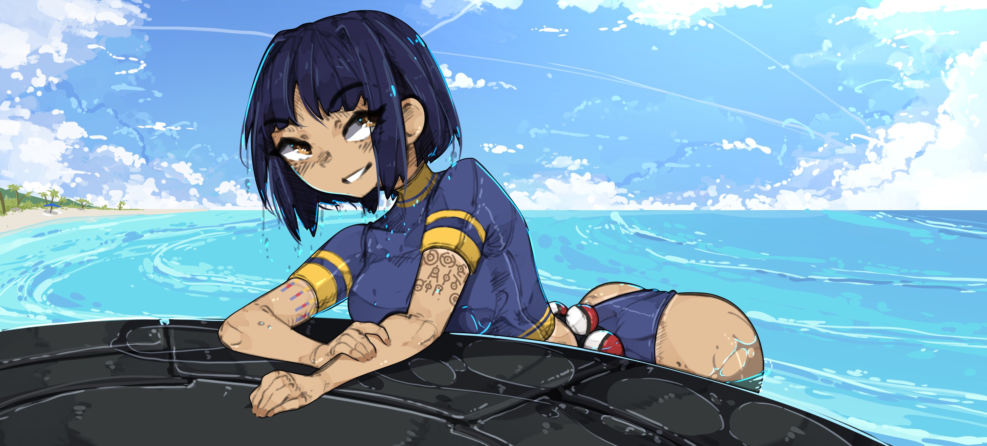 1girl absurdres arm_support arm_tattoo ass beach black_hair breasts brown_eyes cloud commission day female_focus gen_2_pokemon highres kate_mikolajczyk_(silverfox442) medium_breasts nintendo ocean outdoors poke_ball pokemon short_hair short_sleeves shuuko_(s_h_uuko) sidelocks sky solo swimsuit tattoo unown