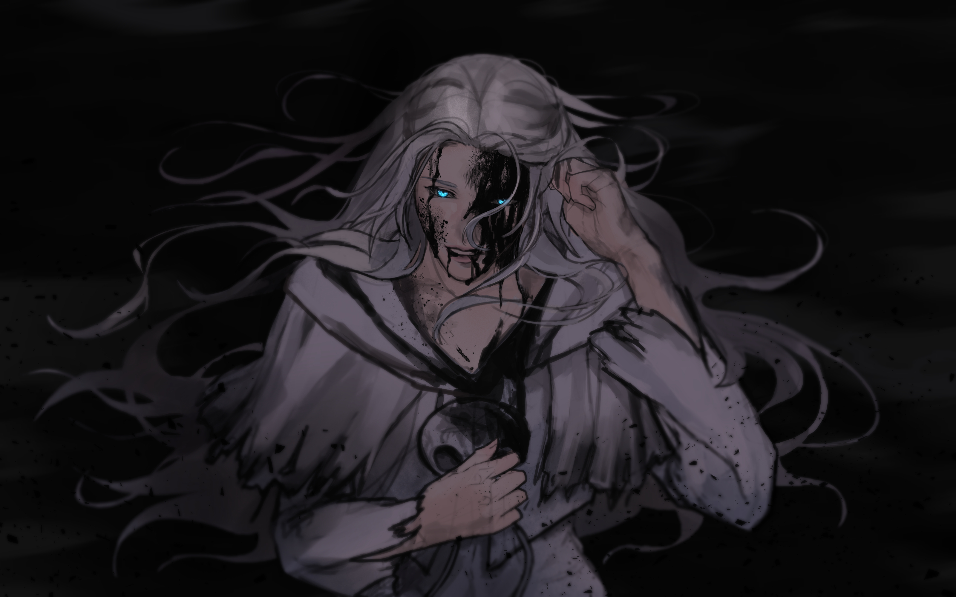 1girl absurdres black_background black_blood blood blood_from_mouth blood_on_clothes blood_on_face blue_eyes capelet commentary_request dirty dirty_clothes dirty_face dirty_hands final_fantasy final_fantasy_xiv floating_hair glowing glowing_eyes grey_hair hand_in_own_hair hand_on_own_chest hand_up highres hood hood_down hooded_capelet korean_commentary long_hair looking_at_viewer mask mask_around_neck robe simple_background solo sophist's_robe_(ff14) stylized_blood torn_clothes torn_robe unworn_mask venat_(ff14) white_capelet white_robe xanthine_999