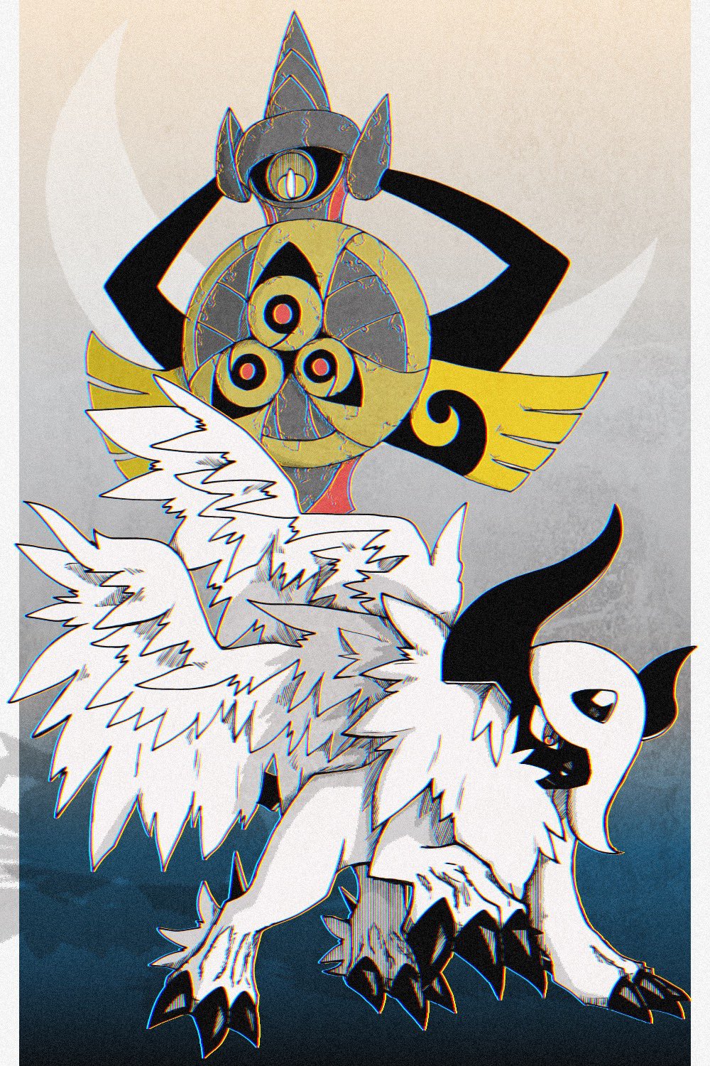 359yuyu absol aegislash alternate_color claws feathered_wings full_body gen_3_pokemon gen_6_pokemon highres horns looking_down mega_absol mega_pokemon nintendo no_humans pokemon pokemon_(creature) red_eyes shield shiny_pokemon solo standing sword veins weapon white_hair wings yellow_eyes