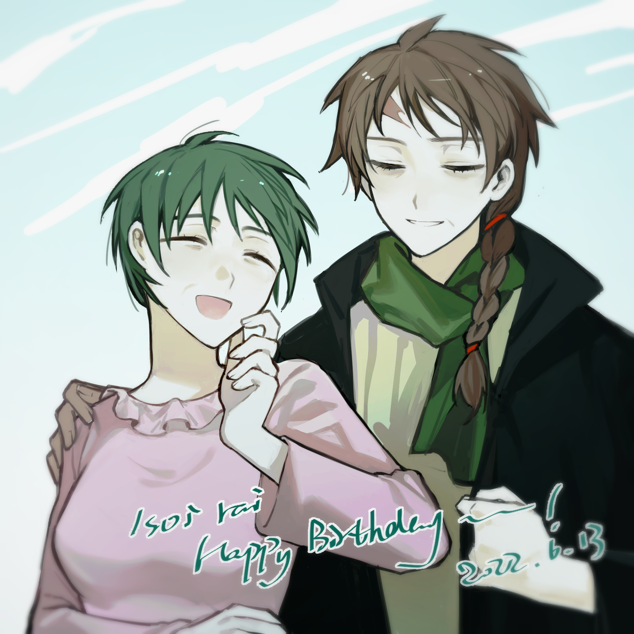 1boy 1girl black_jacket braid brown_hair character_name chinese_commentary closed_eyes commentary_request dated english_text frilled_shirt frills green_hair green_scarf happy_birthday harada_minoru highres isoi_rai jacket kyoko_(akakikyoko) long_sleeves mature_female open_clothes open_jacket open_mouth pink_shirt saibou_shinkyoku scarf shirt side_braid single_braid smile yellow_shirt