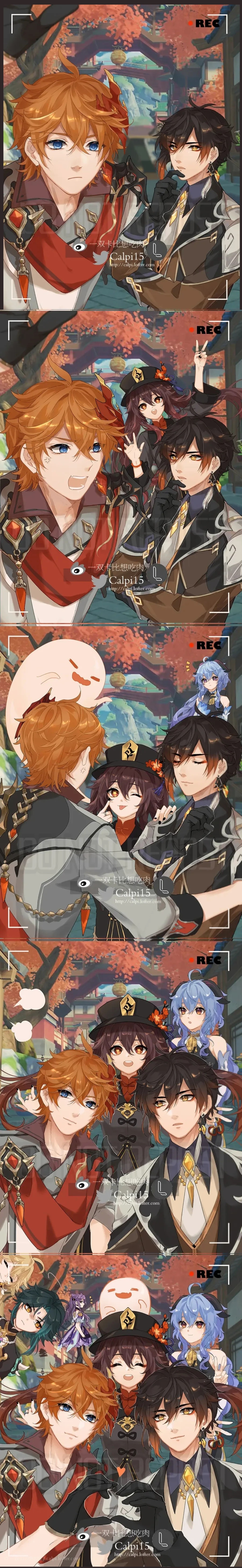 absurdres aether_(genshin_impact) boo_tao_(genshin_impact) calpi15 camera ganyu_(genshin_impact) genshin_impact group_picture heart heart_hands heart_hands_duo highres hu_tao_(genshin_impact) keqing_(genshin_impact) lofter lofter_logo lofter_username outdoors recording tartaglia_(genshin_impact) viewfinder zhongli_(genshin_impact)