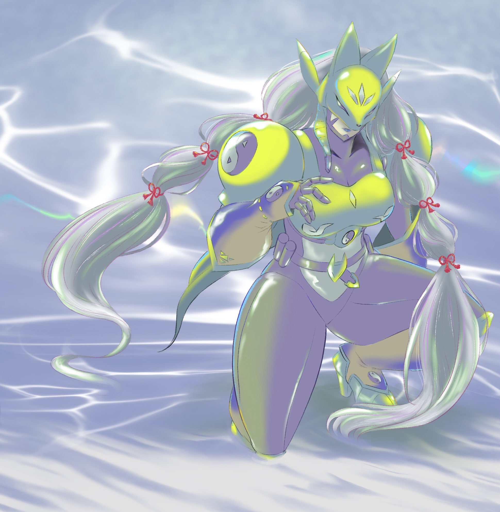 1girl armor black_bodysuit bodysuit breasts commentary_request covered_eyes digimon digimon_(creature) fox_mask full_body gold_armor grey_hair highres long_hair low_twintails mas_square mask medium_breasts on_one_knee sakuyamon shoulder_armor solo twintails