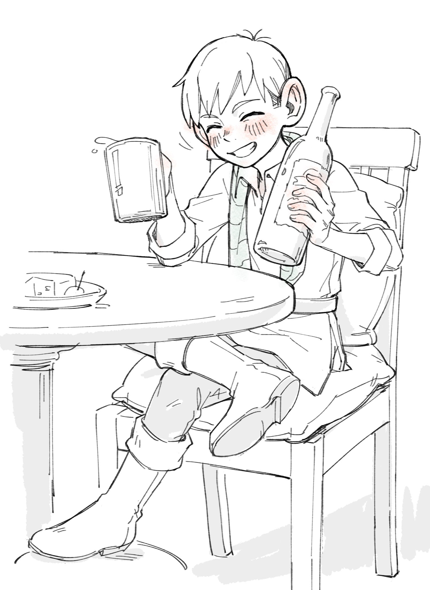 1boy alcohol beer_mug blush boots bottle chair chilchuck_tims closed_eyes commentary cup dm_kitsune dungeon_meshi greyscale grin highres holding holding_bottle holding_cup male_focus monochrome mug pants shirt simple_background sitting smile solo spot_color untranslatable_commentary table