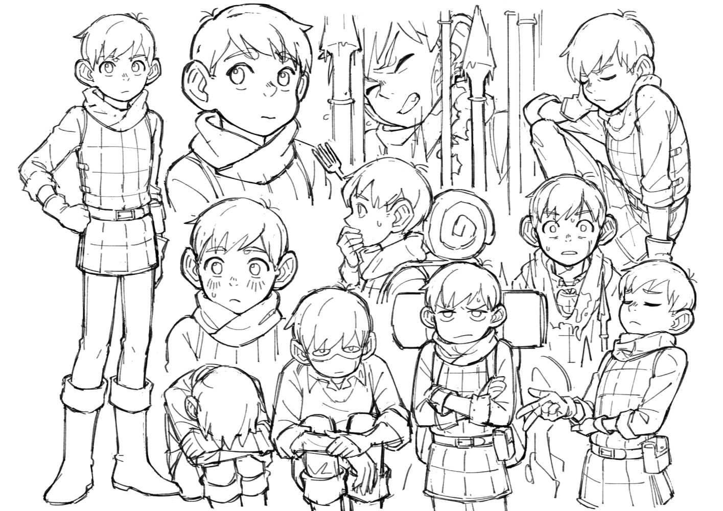 armor blood blush boots chilchuck_tims closed_eyes closed_mouth crossed_arms dm_kitsune dungeon_meshi fingerless_gloves gloves greyscale hand_on_own_hip hand_to_own_mouth leather_armor monochrome multiple_views neck_warmer pants shaded_face simple_background sitting standing sweat
