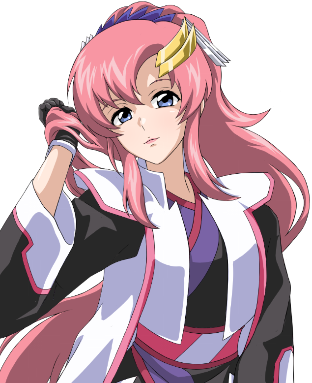 1girl black_gloves black_kimono blue_eyes breasts gloves gundam gundam_seed gundam_seed_freedom hair_ornament japanese_clothes kimono lacus_clyne long_hair looking_at_viewer obi pink_hair ponytail safety_kaijo sash smile solo very_long_hair