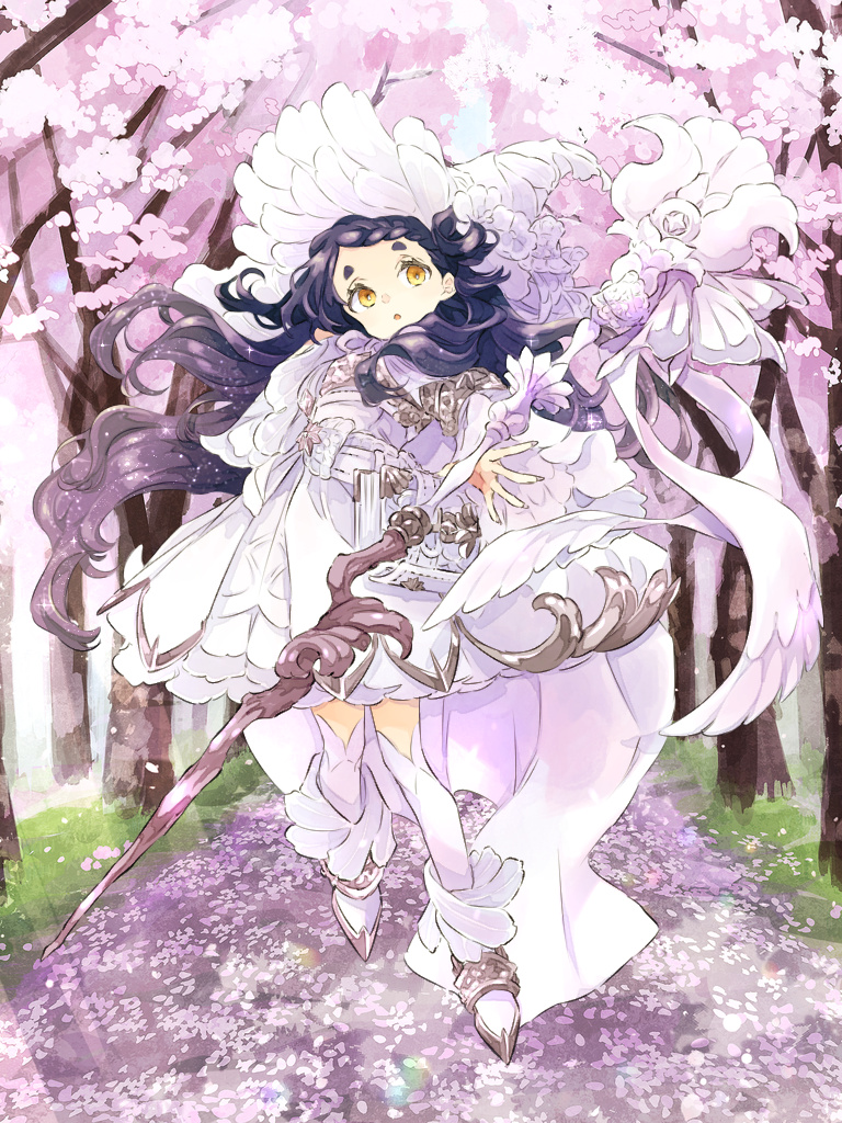 1girl black_hair dairoku_ryouhei day fille_meruku full_body hat holding holding_staff long_hair looking_at_viewer outdoors seiyakarutaken solo staff thighhighs very_long_hair white_hat white_thighhighs yellow_eyes