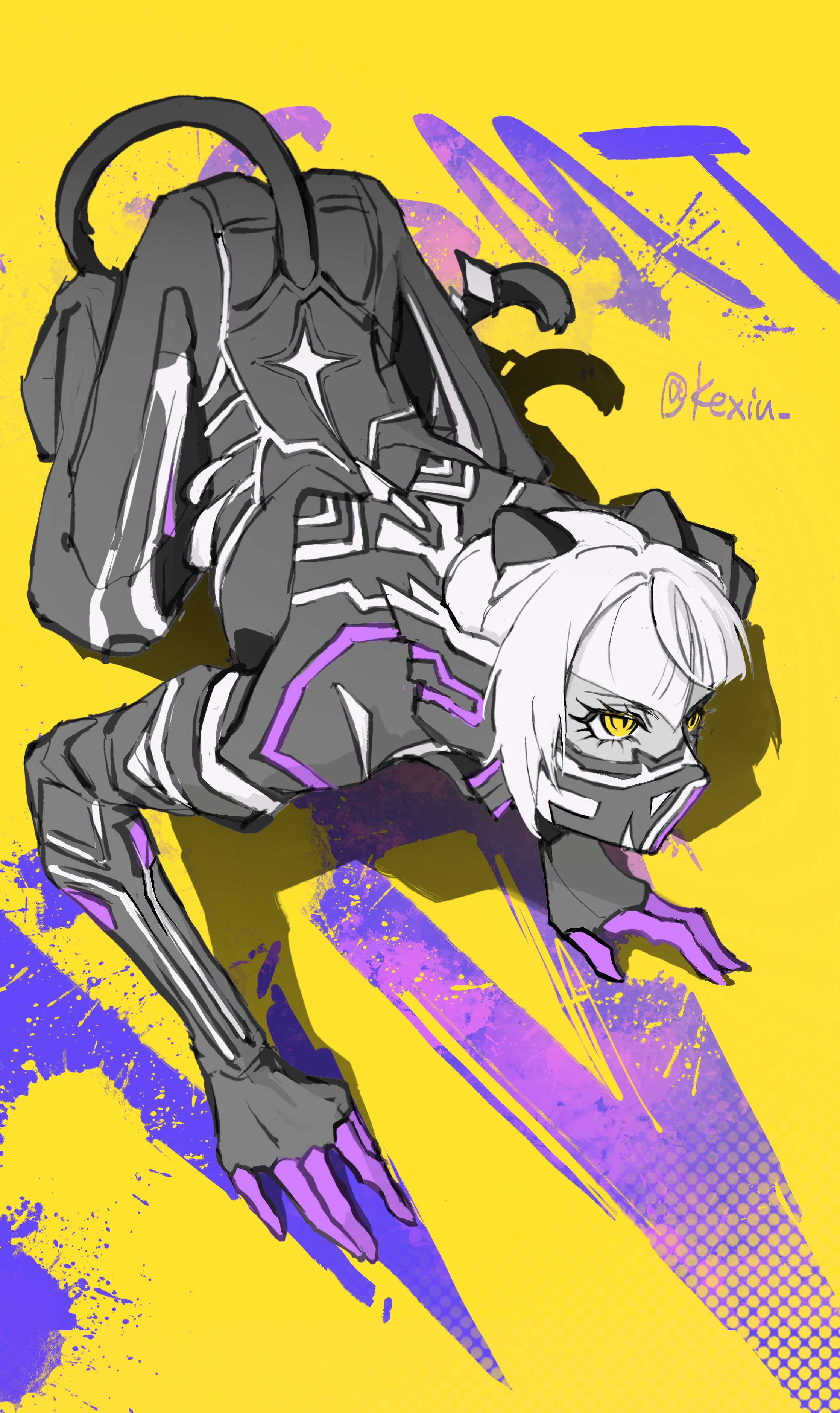 1boy absurdres all_fours androgynous armor asymmetrical_hair bodysuit copyright_name eyelashes greyscale_with_colored_background highres kexiu male_focus protagonist_(smtv) protagonist_(tsukuyomi_nahobino)_(smtv) shin_megami_tensei shin_megami_tensei_v shin_megami_tensei_v:_vengeance short_hair single_sidelock sketch solo tail twitter_username yellow_background yellow_eyes