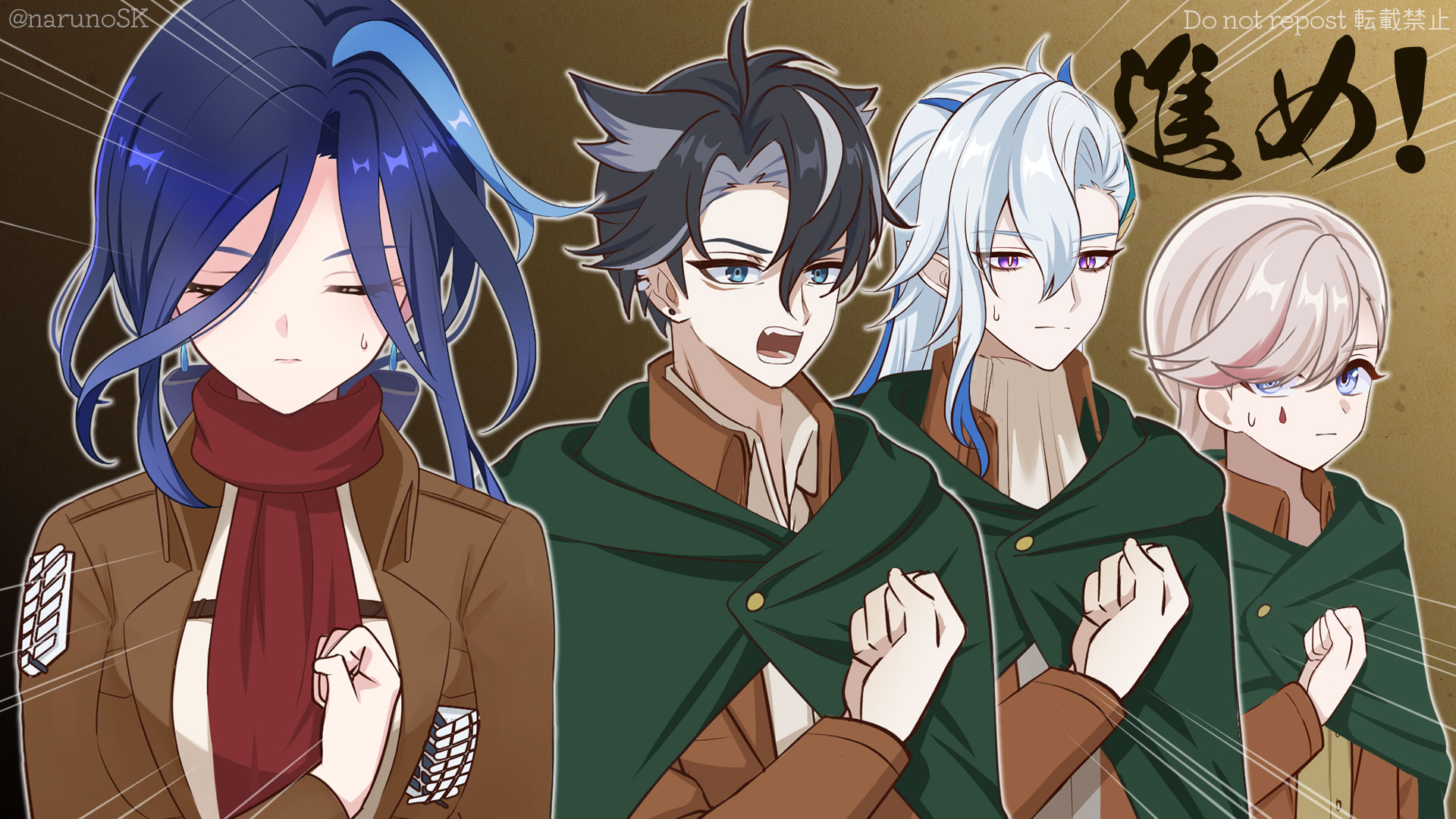 1girl 3boys black_hair blue_eyes blue_hair brown_jacket cloak clorinde_(genshin_impact) closed_eyes earrings facial_mark facing_viewer genshin_impact green_cloak grey_hair highres jacket jewelry long_hair long_sleeves lyney_(genshin_impact) multiple_boys naruno_suke_(narunosk) neuvillette_(genshin_impact) purple_eyes red_scarf scar scarf shingeki_no_kyojin shirt short_hair voice_actor_connection white_hair white_shirt wriothesley_(genshin_impact)