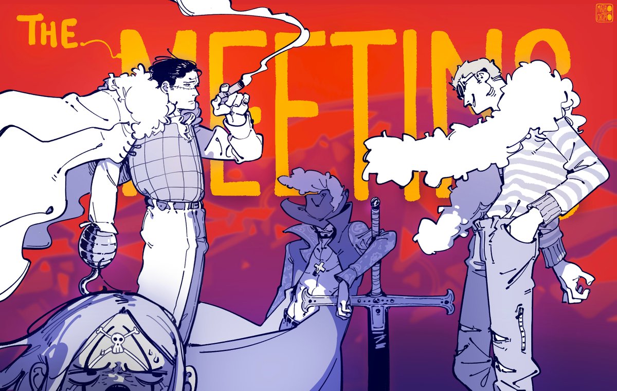 4boys artist_logo black_hair blonde_hair blue_hair buggy_the_clown checkered_clothes checkered_vest cigar coat crocodile_(one_piece) cross cross_necklace donquixote_doflamingo dracule_mihawk english_text facial_hair feather_boa goatee hand_in_pocket hat_feather high_collar holding holding_cigar holding_sword holding_weapon hook_hand jewelry logo long_hair looking_at_another male_focus mazaochizao multiple_boys muscular muscular_male mustache necklace one_piece open_clothes partially_colored scar scar_on_face shirt sideburns smile sunglasses sword vest weapon white_shirt yoru_(sword)