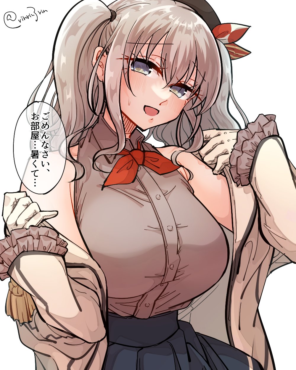 1girl beret blue_eyes blush breasts epaulettes frilled_sleeves frills gloves grey_hair hat highres jacket kantai_collection kashima_(kancolle) large_breasts long_hair long_sleeves looking_at_viewer matsunaga_(haku) military_jacket military_uniform neckerchief open_clothes open_jacket open_mouth pleated_skirt red_neckerchief simple_background skirt smile solo speech_bubble twintails twitter_username upper_body wavy_hair white_background white_gloves