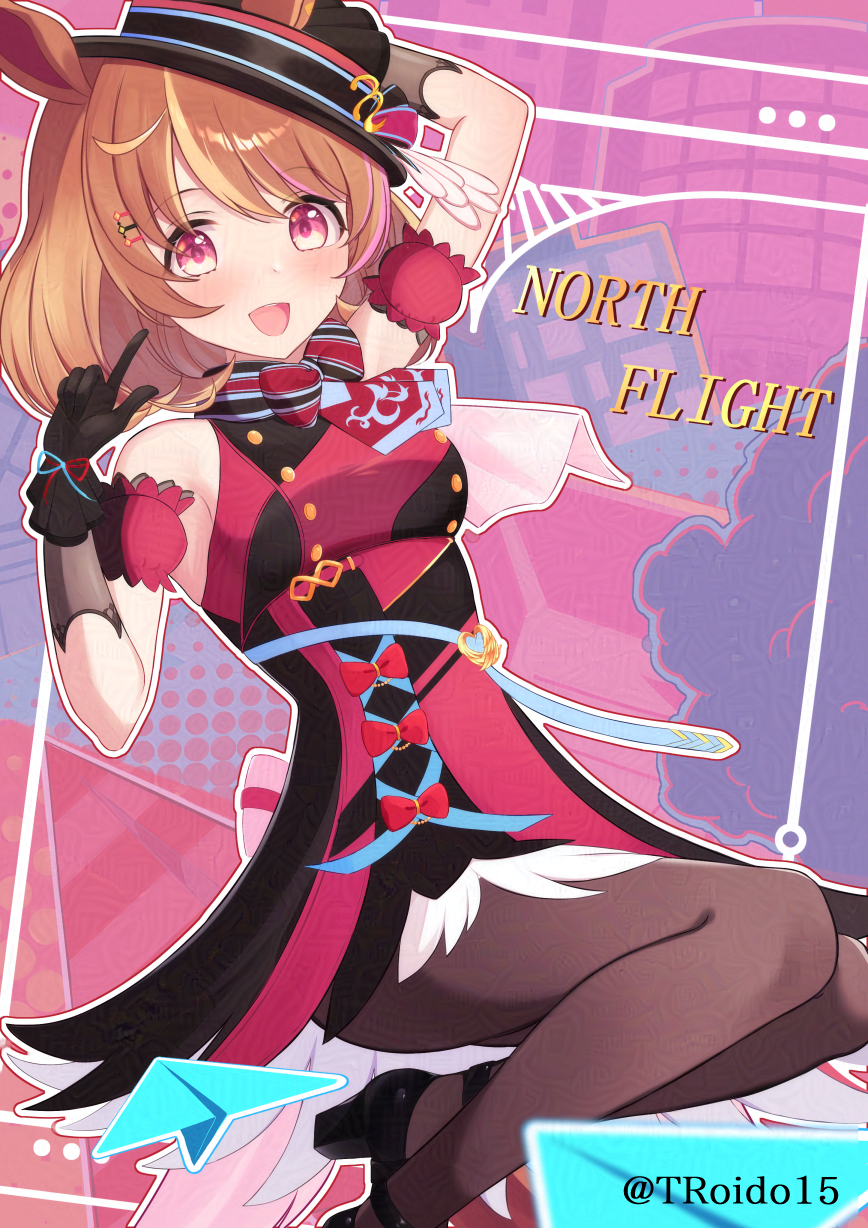 1girl :d adversarial_noise animal_ears arm_up armpits bare_shoulders black_gloves black_hat black_shoes breasts brown_hair brown_pantyhose character_name commentary_request detached_sleeves dress ears_through_headwear gloves hair_ornament hairclip hat high_heels highres horse_ears horse_girl horse_tail looking_at_viewer medium_breasts multicolored_hair north_flight_(looking_fly!)_(umamusume) north_flight_(umamusume) open_mouth pantyhose puffy_short_sleeves puffy_sleeves purple_eyes red_dress red_sleeves roido_(taniko-t-1218) shoes short_sleeves smile solo streaked_hair tail tilted_headwear twitter_username umamusume