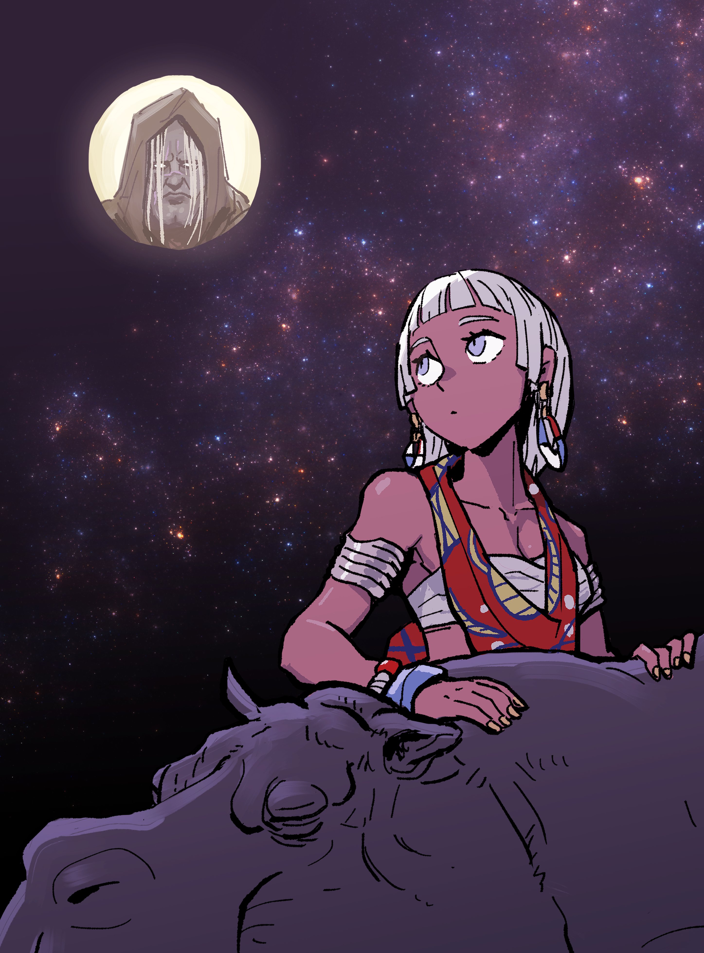 1girl absurdres animal bracelet dark-skinned_female dark_skin elena_(street_fighter) handstand highres hippopotamus jewelry kangyaku m._bison moon short_hair sky solo star_(sky) street_fighter street_fighter_6 very_dark_skin white_hair
