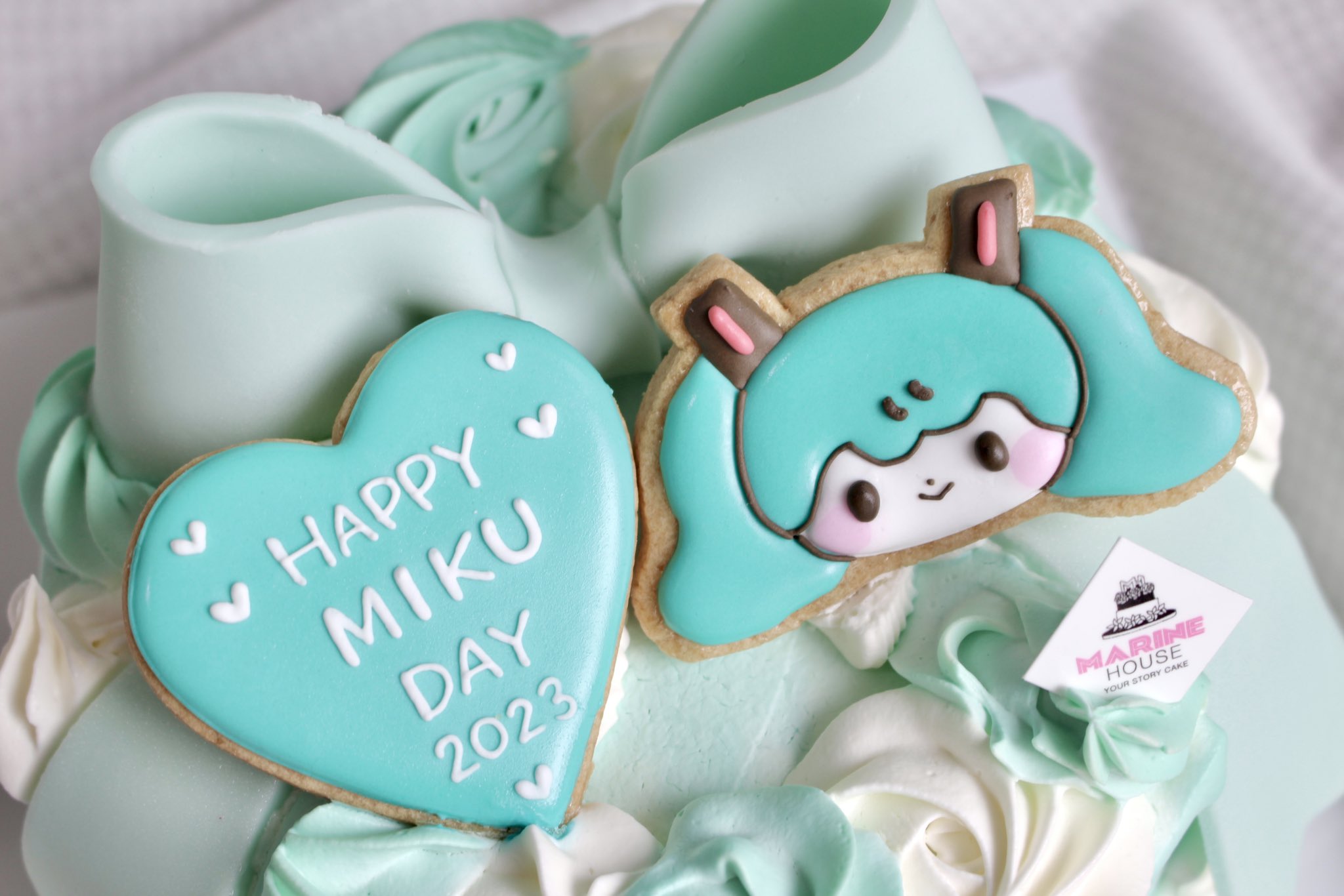 1girl 2023 :> aqua_bow aqua_hair aqua_theme black_eyes blush_stickers bow cake character-themed_food closed_mouth commentary_request cookie english_text food food_art_(medium) food_focus hair_ornament hatsune_miku head_only heart heart-shaped_cookie heart-shaped_food highres long_hair miku_day pale_skin photo_(medium) smile solid_oval_eyes solo takakura_(mug_0u0) twintails unconventional_media vocaloid