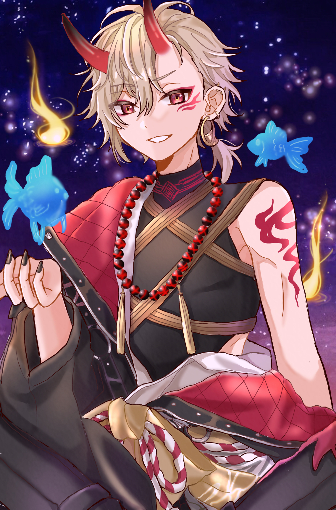 18trip 1boy arm_tattoo asako_(puiu9k) black_gloves blonde_hair earrings fire fish gloves highres japanese_clothes jewelry kurama_ushio looking_at_viewer low_ponytail male_focus medium_hair official_alternate_costume official_alternate_hairstyle oni ponytail red_eyes smile solo tattoo teeth