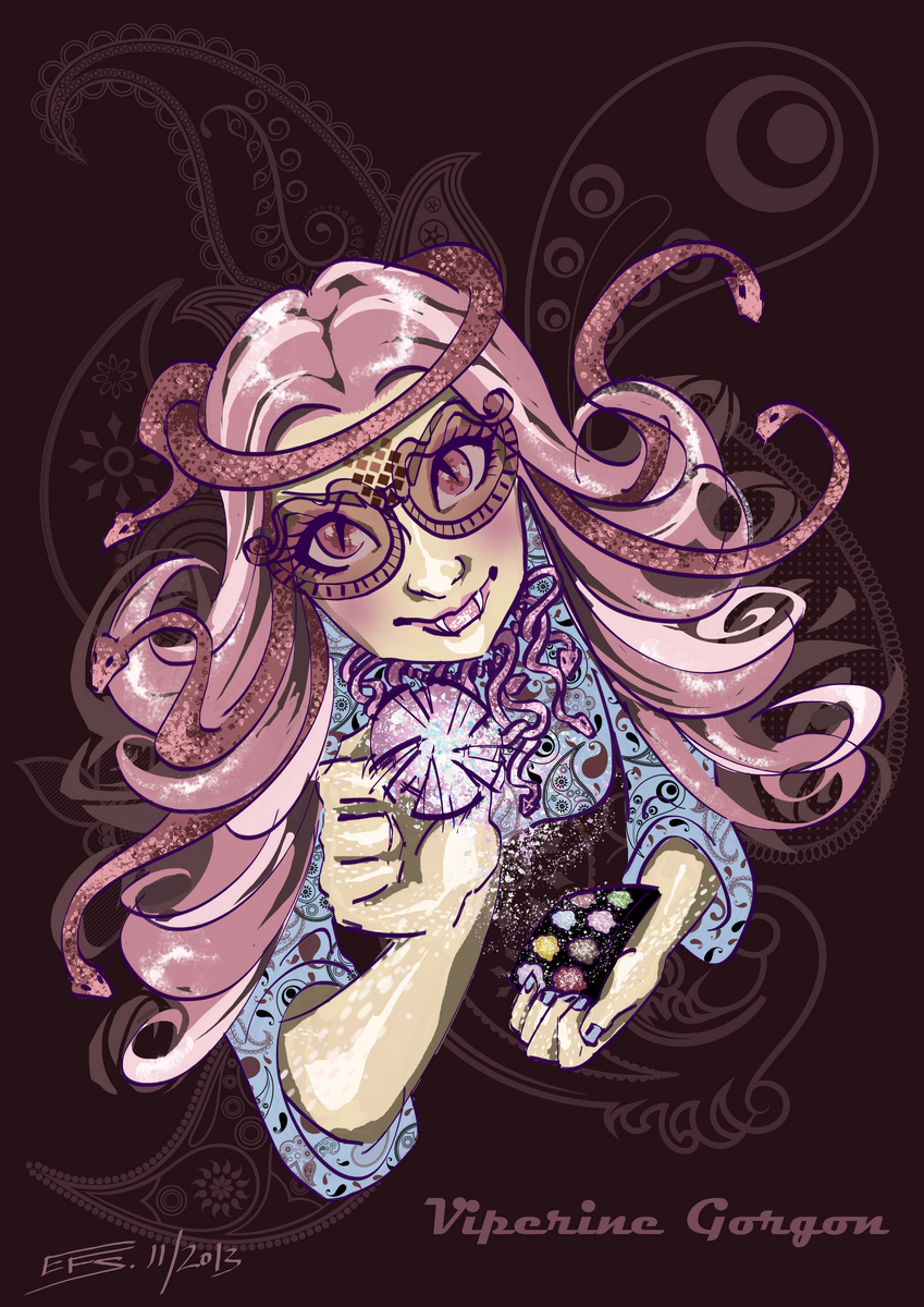 1girl dress elisafs floral_print floral_print_dress highres holding holding_brush holding_makeup_brush long_hair looking_at_viewer makeup_brush monster_high monster_high_(g1) pink-tinted_eyewear pink_hair print_dress scales slit_pupils snake_hair solo tinted_eyewear viperine_gorgon