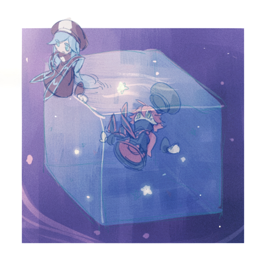 2girls black_hat black_robe black_wrist_cuffs blue_eyes blue_hair border chinese_commentary commentary_request covered_mouth cube disembodied_hand dress flamberge_(kirby) francisca_(kirby) full_body gloves hair_spread_out hat hat_loss kirby_(series) kirby_star_allies long_hair multiple_girls newsboy_cap nintendo open_mouth outside_border red_dress red_hair red_trim ripples robe shaped_liquid short_hair siblings sisters sitting sitting_on_liquid smile somayumi space star_(symbol) straight_hair submerged turtleneck very_long_hair water white_border white_gloves wrist_cuffs