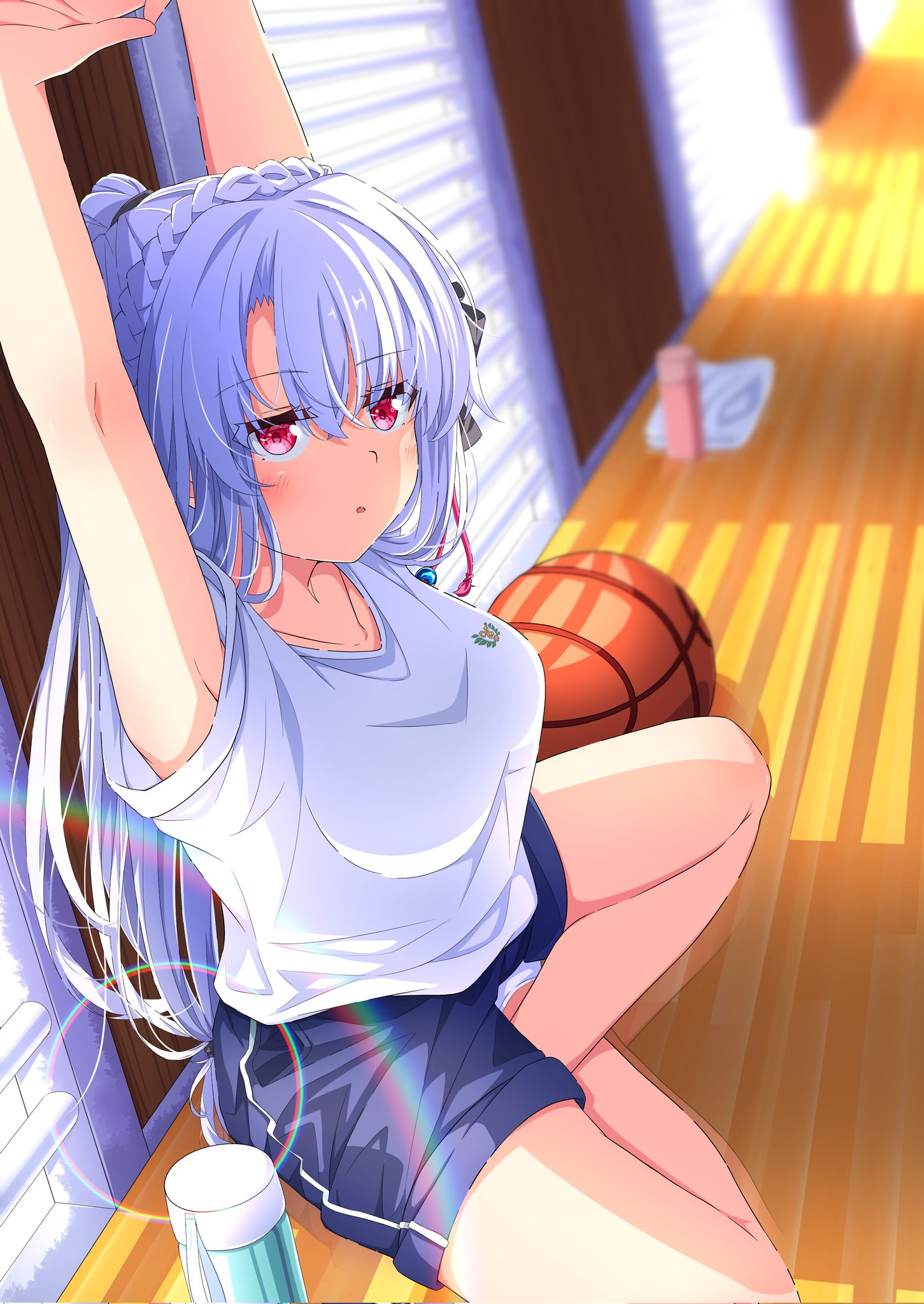 1girl :o alternate_costume alternate_hairstyle arms_up backlighting ball basketball_(object) blue_hair blue_shorts blurry blush braid breasts collarbone commentary commission crossed_bangs crown_braid day depth_of_field eyes_visible_through_hair gym_uniform hair_between_eyes highres indian_style indoors jitome knees_out_of_frame kyamiuu large_breasts lens_flare long_hair looking_at_viewer open_mouth perspective ponytail red_eyes shirt short_sleeves shorts sitting skeb_commission solo sorakado_ao straight_hair stretching summer_pockets untranslatable_commentary thighs upturned_eyes very_long_hair white_shirt window