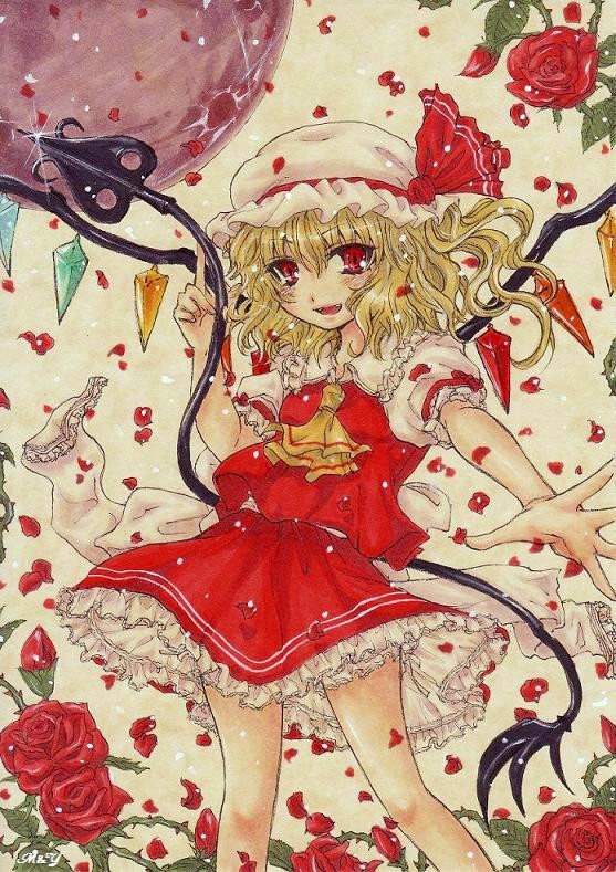 1girl ascot back_bow bow collared_shirt feet_out_of_frame flandre_scarlet flower frilled_shirt_collar frilled_skirt frilled_sleeves frills hair_between_eyes hat hat_ribbon holding holding_polearm holding_weapon laevatein_(touhou) large_bow looking_at_viewer mob_cap multicolored_wings open_mouth polearm puffy_short_sleeves puffy_sleeves red_eyes red_flower red_ribbon red_rose red_skirt red_vest ribbon rose shirt short_sleeves skirt sleeve_ribbon thorns touhou vest weapon white_bow white_hat white_shirt wings yellow_ascot yukito_lin