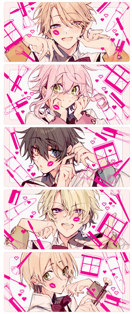 5boys blonde_hair ensemble_stars! eyelash_curler eyeliner eyeshadow green_eyes heterochromia himemiya_tori kagehira_mika lipstick looking_at_viewer makeup makeup_brush male_focus multiple_boys narukami_arashi open_mouth pink_hair purple_eyes sapphire_(nine) shiratori_aira_(ensemble_stars!) simple_background smile tomoe_hiyori upper_body white_background