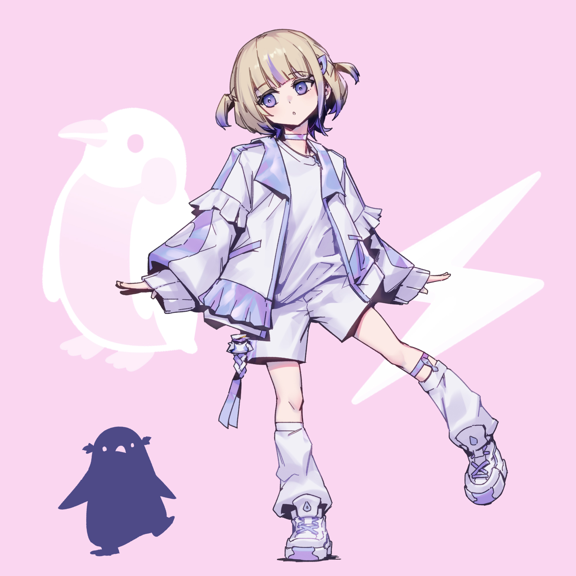 1girl bird blonde_hair choker full_body highres hololive hololive_dev_is jacket leg_warmers penguin phantom_cross pink_background purple_choker purple_eyes purple_jacket shoes shorts sneakers todoroki_hajime todoroki_hajime_(1st_costume) two_side_up virtual_youtuber