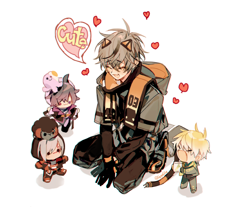 4boys alban_knox animal_ears black_footwear black_gloves black_pants black_shirt blush cat_ears closed_eyes comfydant_(fulgur_ovid) electric_plug electric_plug_tail fulgur_ovid gloves grey_jacket heart hood hood_down jacket kneeling male_focus mini_person miniboy multiple_boys nijisanji nijisanji_en open_mouth pants sapphire_(nine) shirt shoes simple_background smile sonny_brisko stargazer_(uki_violeta) tail uki_violeta virtual_youtuber white_background