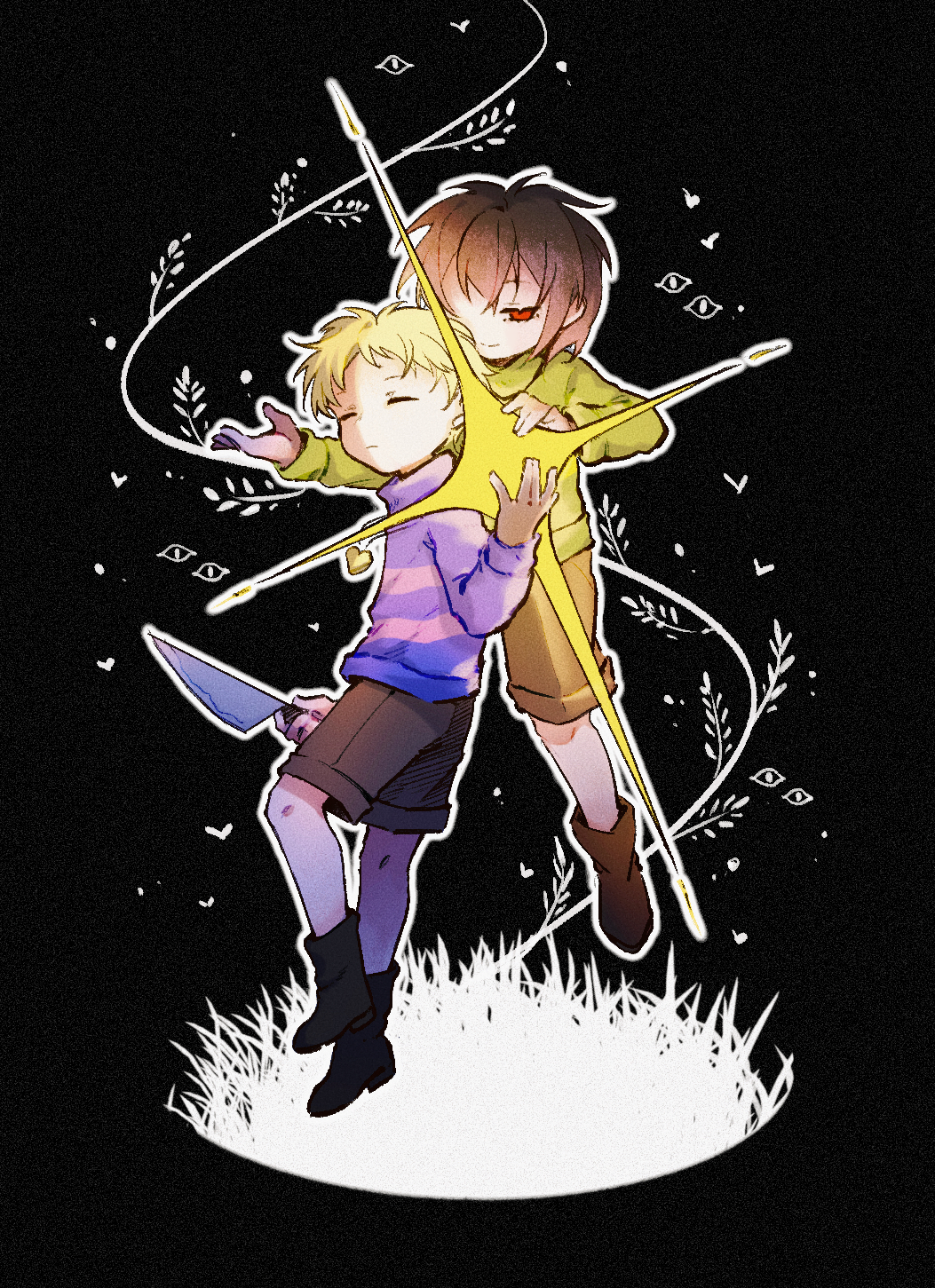 2boys atou_haruki black_boots black_shorts blonde_hair boots brown_boots brown_hair brown_shorts chara_(undertale) chara_(undertale)_(cosplay) chinese_commentary closed_eyes closed_mouth commentary_request cosplay film_grain frisk_(undertale) frisk_(undertale)_(cosplay) green_sweater heart heart_necklace highres holding holding_knife jewelry knife male_focus multicolored_hair multiple_boys necklace origin_alpha outline pink_hair purple_sweater red_eyes saibou_shinkyoku short_hair shorts simian_qiao_gu smile sparkle sweater turtleneck turtleneck_sweater undertale utdr_(toby_fox) white_outline