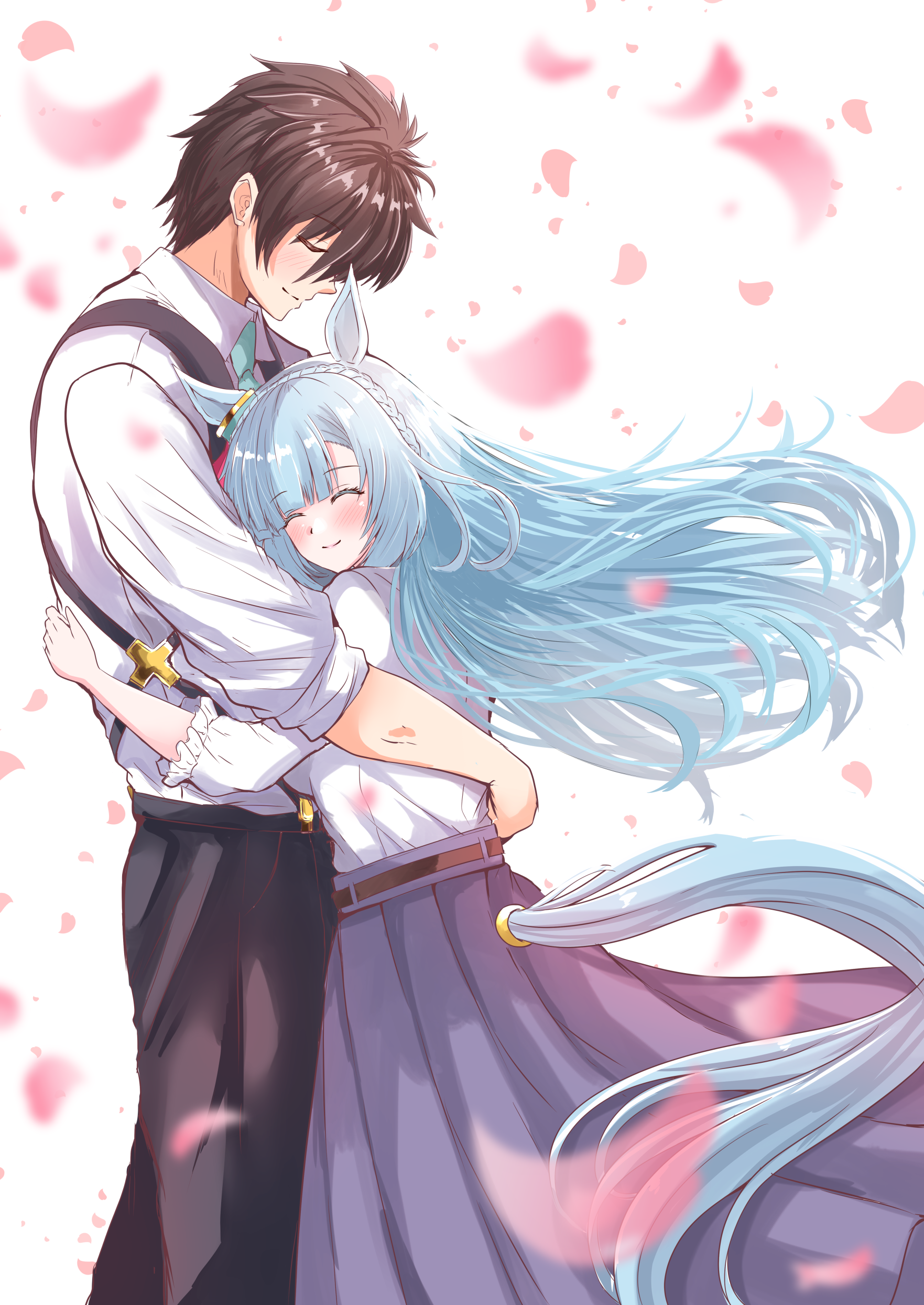 1boy 1girl absurdres animal_ears black_hair blue_eyes blush braid casual closed_eyes closed_mouth crown_braid hair_ornament highres horse_ears horse_girl hug kentan_(kingtaiki) long_hair mejiro_ardan_(casual)_(umamusume) mejiro_ardan_(umamusume) petals smile trainer_(umamusume) umamusume white_background