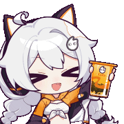 >_< 1girl animal_ears animated animated_gif blue_eyes bubble_tea cat_ears chibi drink fake_animal_ears hair_between_eyes hair_ornament holding holding_drink honkai_(series) honkai_impact_3rd jacket kiana_kaslana kiana_kaslana_(coco) long_hair lowres midriff official_art orange_jacket shirt tied_shirt very_long_hair white_shirt