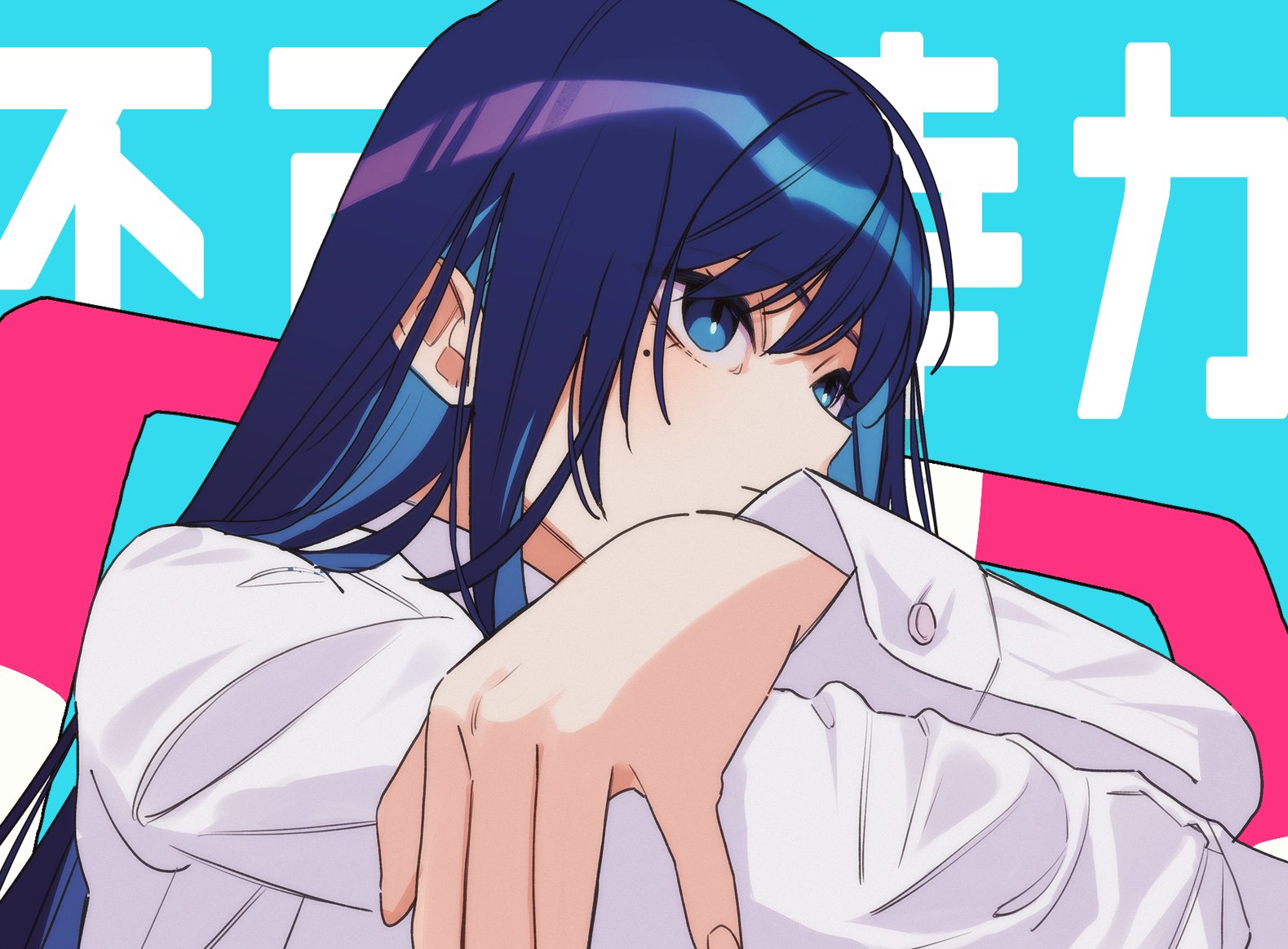 1girl ado_(utaite) blue_background blue_eyes blue_hair chando_(ado) commentary dark_blue_hair dress_shirt hashtag-only_commentary long_hair long_sleeves mole mole_under_eye riseno shirt sidelocks solo translation_request upper_body utaite white_shirt