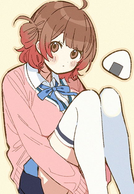 1girl ahoge blue_ribbon blush breasts brown_hair brown_outline cardigan feet_out_of_frame food gakuen_idolmaster hair_bun hanami_ume hatsuboshi_gakuen_school_uniform hugging_own_legs idolmaster knees_up large_breasts looking_at_viewer momose_(oqo) multicolored_hair neck_ribbon onigiri orange_hair pink_cardigan ribbon school_uniform shirt single_side_bun sitting solo thighhighs two-tone_hair white_shirt white_thighhighs yellow_background