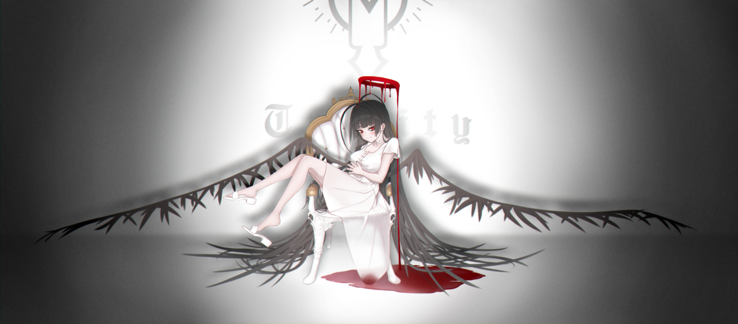 1girl 8000_(pixiv_76944875) black_hair blood blue_archive chair dress feathered_wings halo highres long_hair melting_halo on_chair red_eyes simple_background sitting tsurugi_(blue_archive) very_long_hair white_dress wings