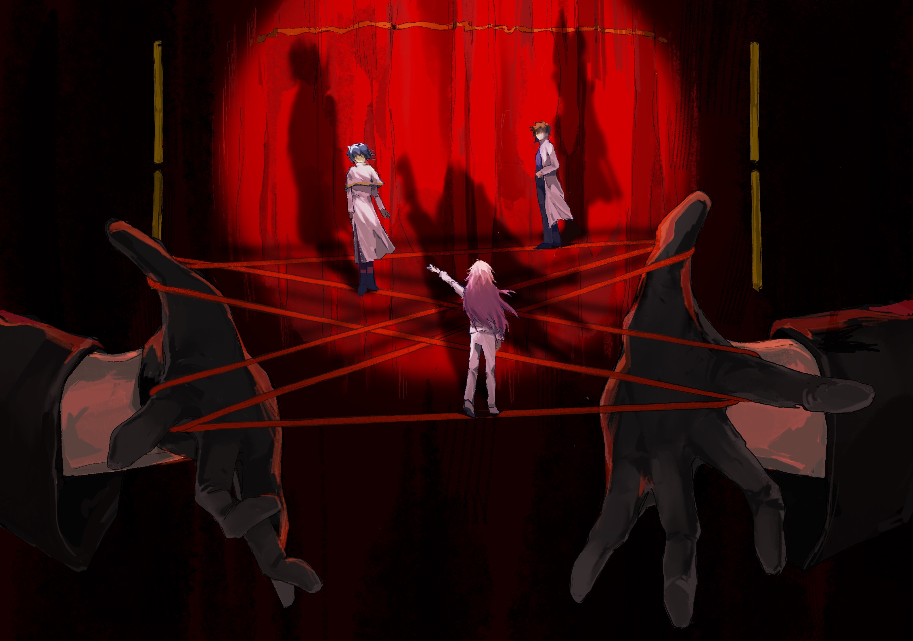 4boys arm_up black_gloves black_pants blue_hair brown_hair capelet cat's_cradle chinese_commentary commentary_request curtains gloves gold_trim harada_minoru hatsutori_hajime highres lab_coat lajiren247 long_hair male_focus multiple_boys open_clothes pants pink_hair purple_shirt red_pants saibou_shinkyoku shirt stage_curtains theodore_riddle utsugi_noriyuki white_capelet white_pants white_shirt