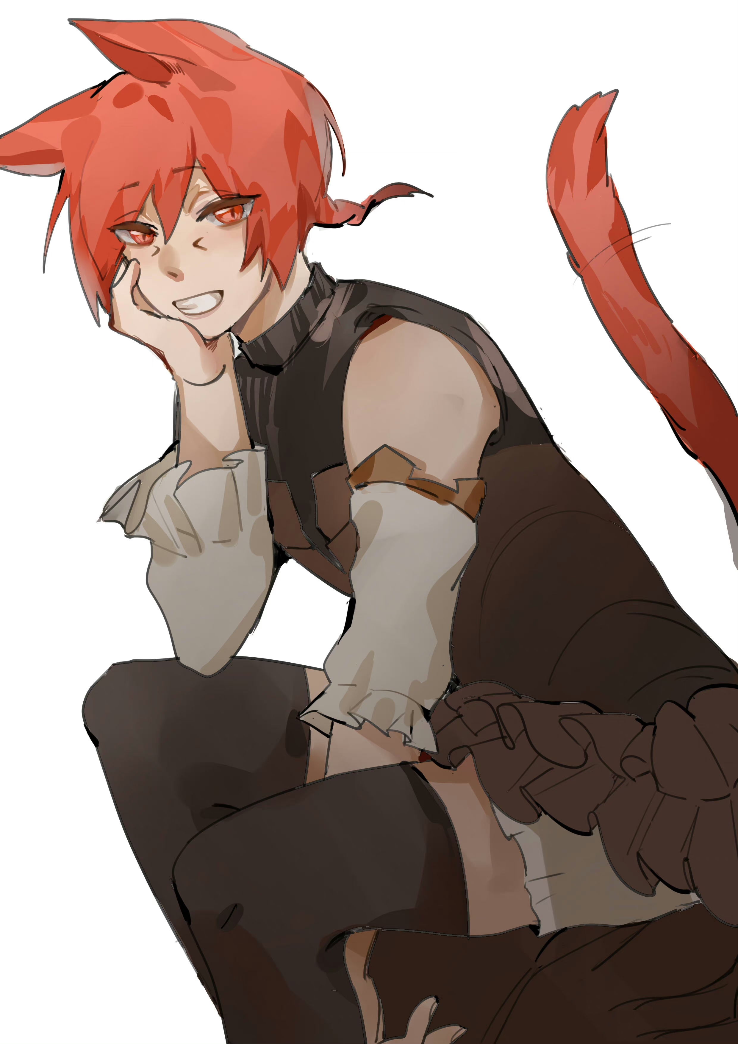 1boy absurdres animal_ears arm_warmers black_sweater black_thighhighs cat_boy cat_ears cat_tail chinese_commentary commentary_request final_fantasy final_fantasy_xiv frilled_arm_wamers frilled_arm_warmers frills g'raha_tia grin hand_on_own_cheek hand_on_own_face highres lajiren247 male_focus miqo'te red_eyes red_hair short_hair shorts simple_background sitting smile solo sweater tail thighhighs turtleneck turtleneck_sweater white_background white_shorts
