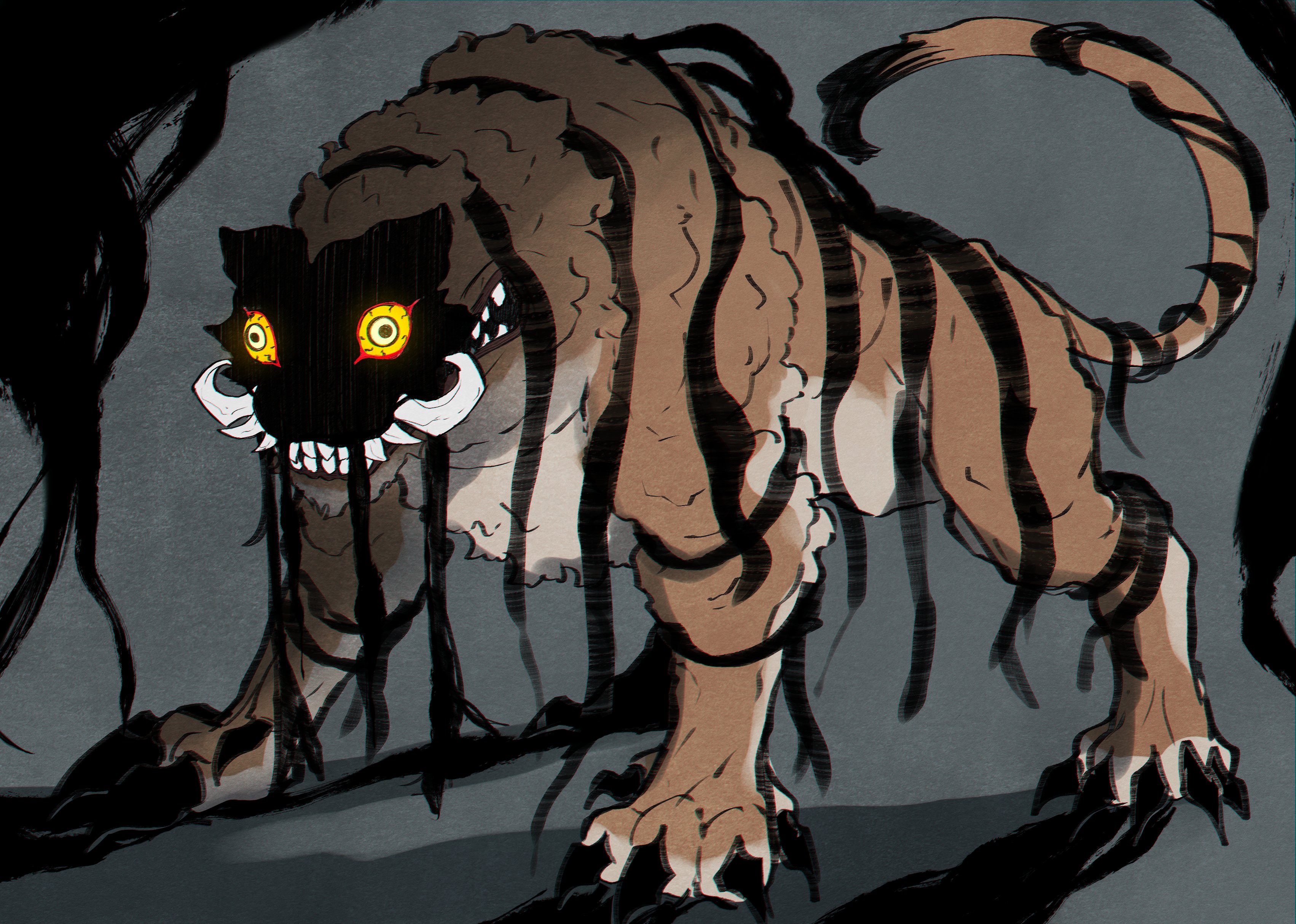 absurdres animal_focus claws clenched_teeth colored_sclera constricted_pupils dream_tiger_(govy9807) full_body glowing glowing_eyes grey_background gwaeji highres monster no_humans original sharp_teeth simple_background solo teeth tiger tusks white_eyes wide_mouth yellow_sclera