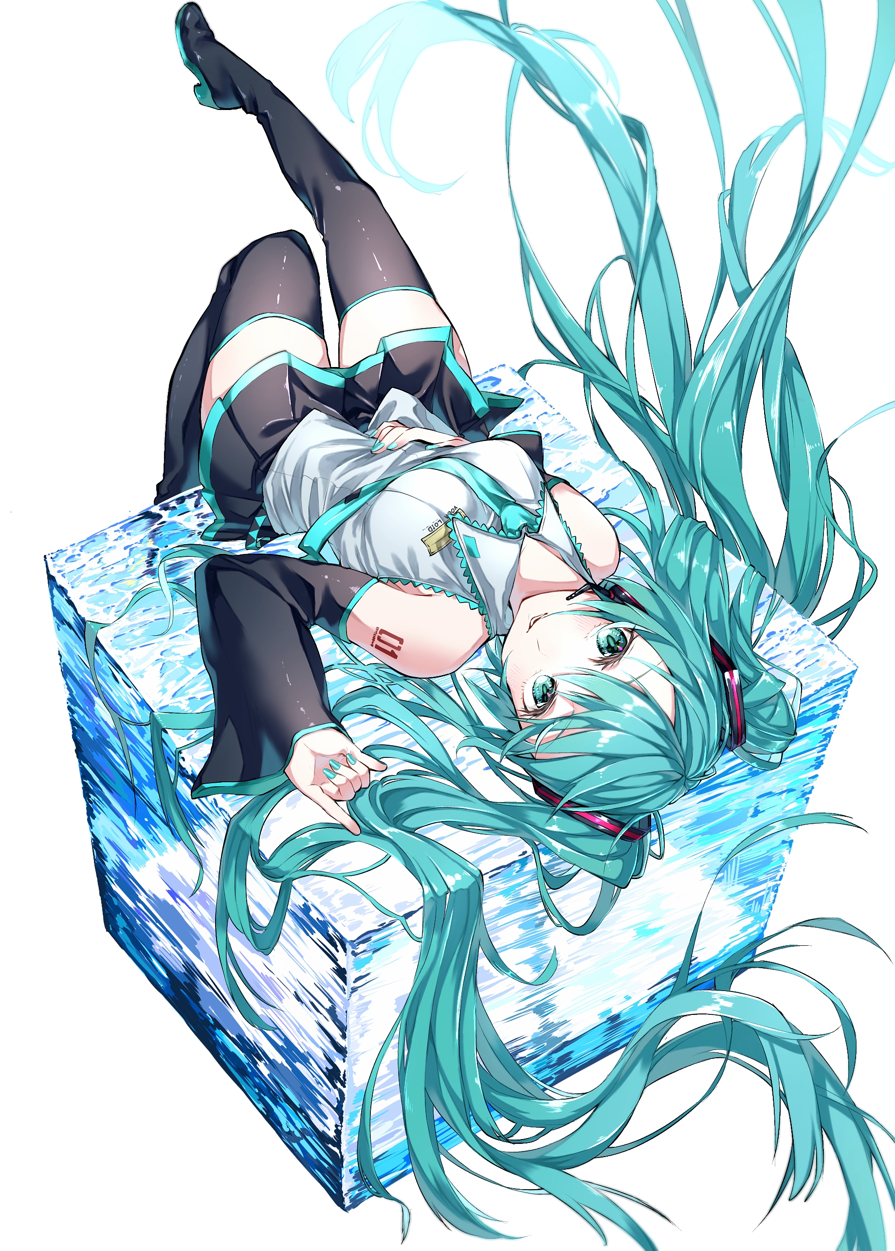 1girl absurdres aiiro aqua_eyes aqua_hair aqua_nails aqua_necktie aqua_trim bare_shoulders black_boots black_skirt black_sleeves boots breasts detached_sleeves floating_hair full_body grey_shirt hair_flowing_over hatsune_miku headphones headset highres ice leg_up long_hair long_sleeves lying medium_breasts miniskirt necktie on_back pleated_skirt shirt simple_background skirt sleeveless solo thigh_boots thighhighs twintails very_long_hair vocaloid white_background wide_sleeves zettai_ryouiki