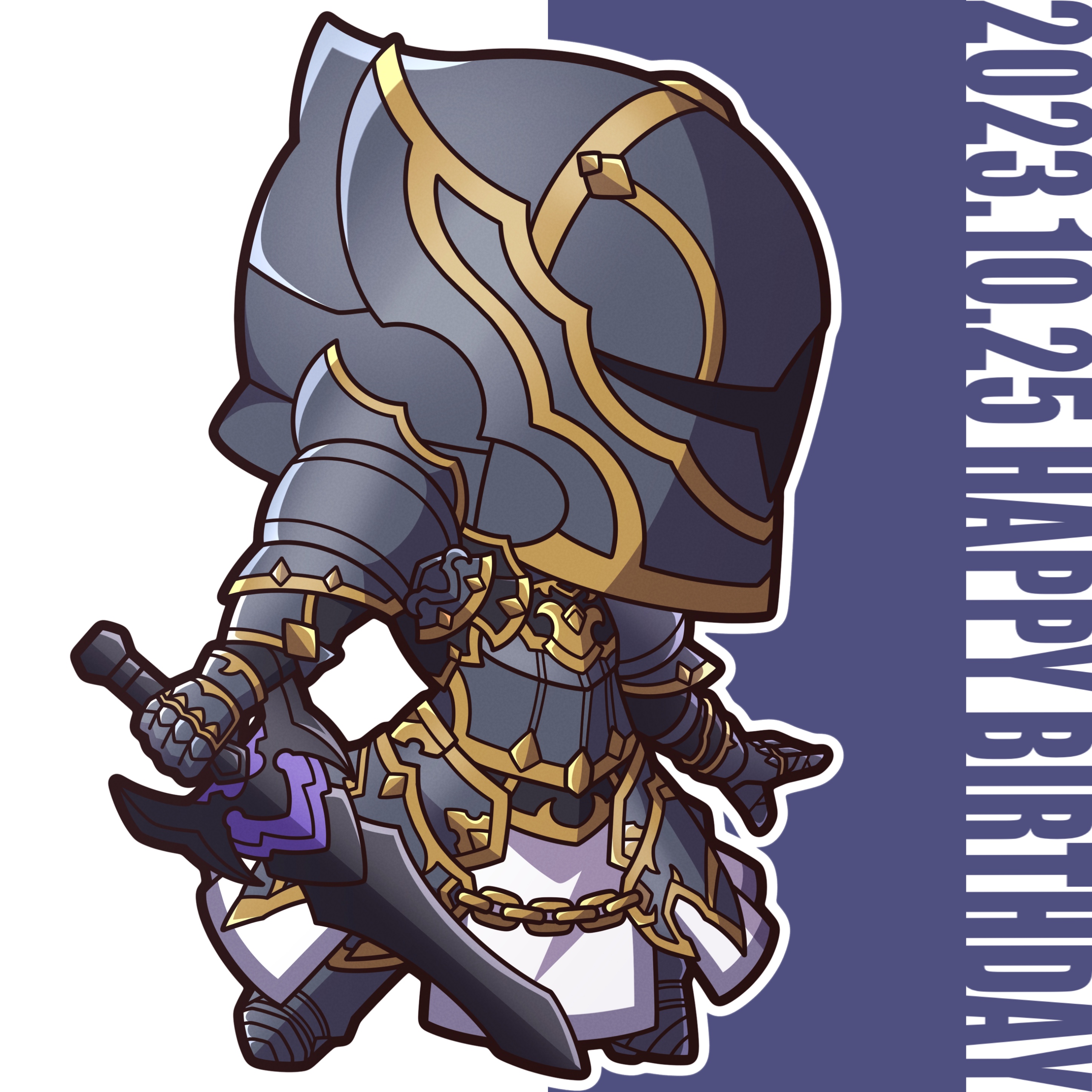 1girl absurdres armor armored_boots blue_background boots breastplate chibi commentary_request dated full_armor full_body gauntlets happy_birthday helm helmet highres holding holding_sword holding_weapon jun_(princess_connect!) outline pauldrons princess_connect! saishosaisekojo shoulder_armor solo standing sword two-tone_background weapon white_background white_outline