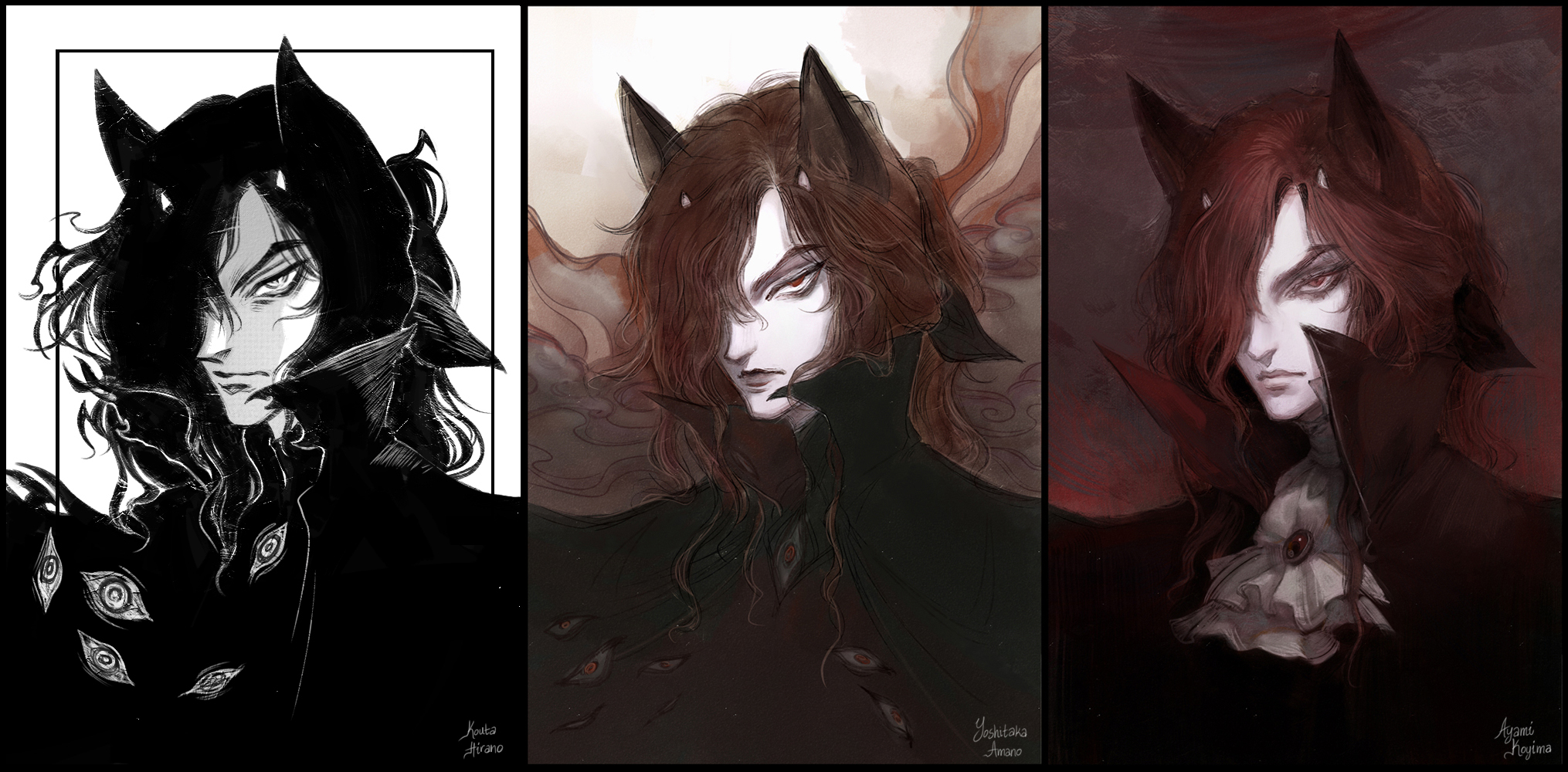 1boy amano_yoshitaka_(style) animal_ears bishounen black_cloak cloak closed_mouth extra_eyes fox_ears frown greyscale high_collar highres hirano_kouta_(style) horns kojima_ayami_(style) long_hair male_focus monochrome multiple_style_parody multiple_views nat_the_lich original painterly parody red_eyes red_hair renard_beauchene_(nat_the_lich) small_horns style_parody wavy_hair