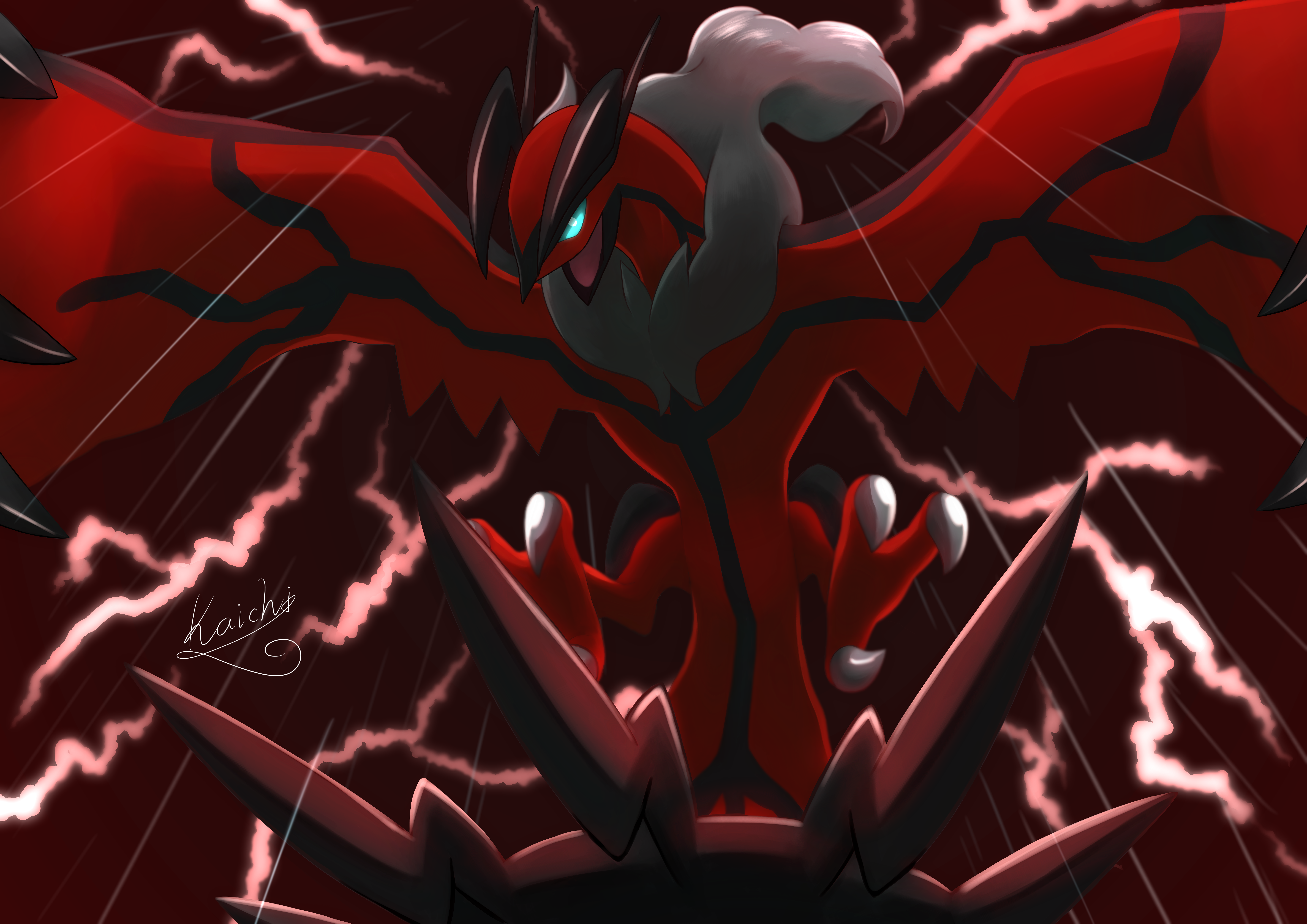 absurdres aqua_eyes commentary_request gen_6_pokemon highres kaichi_(tomiyu25) legendary_pokemon lightning nintendo no_humans open_mouth outdoors pokemon pokemon_(creature) rain signature sky solo talons yveltal