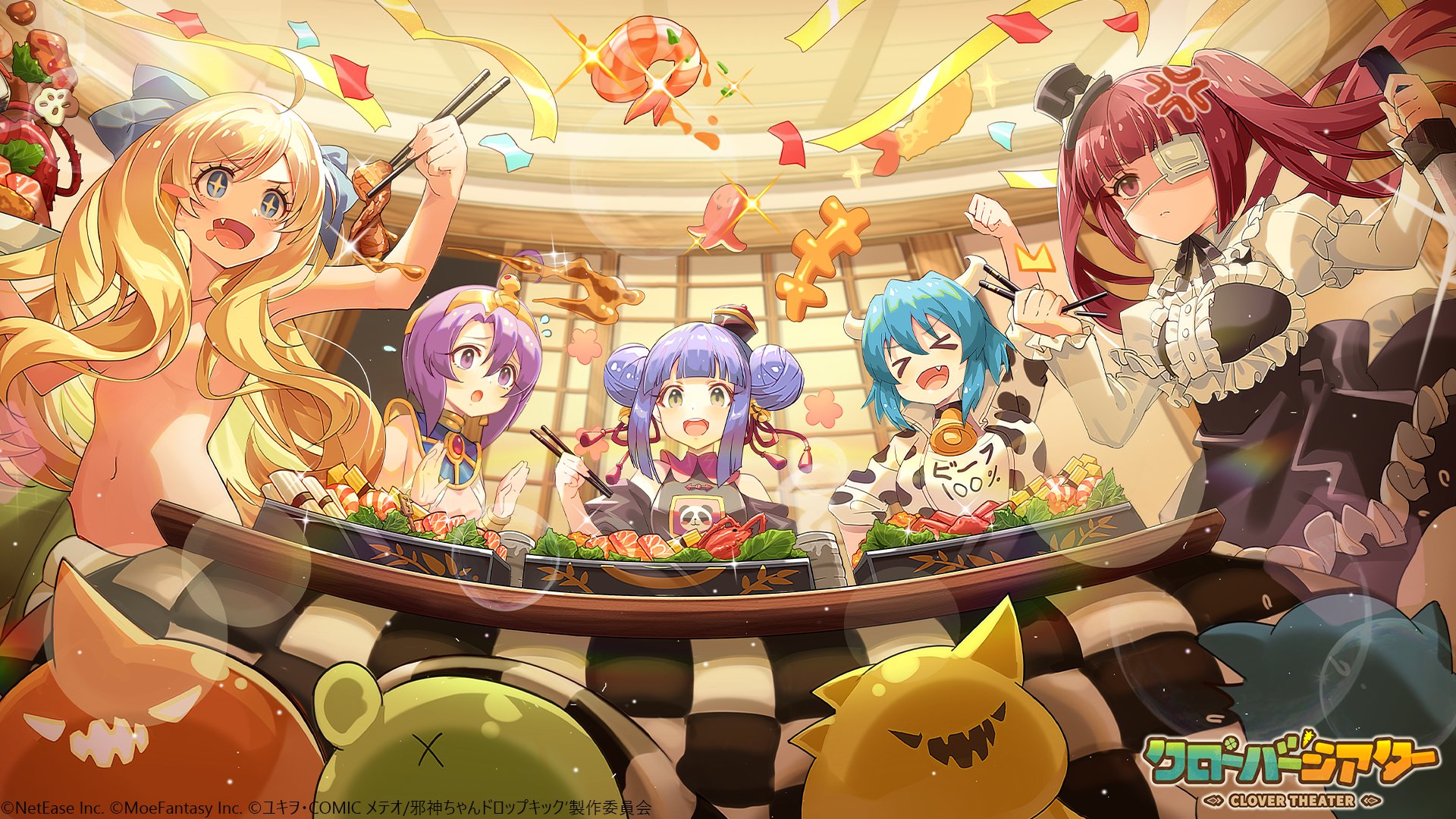 >_< +_+ 5girls ancient_egyptian_clothes anger_vein animal_print artist_collaboration bell black_dress black_hat black_sleeves blonde_hair blue_eyes blue_hair blue_ribbon breasts chinese_clothes chopsticks clover_theater confetti cow_girl cow_horns cow_print detached_sleeves double_bun dress drill_hair eating eyepatch fang fangs gothic_lolita hair_bell hair_bun convenient_hair hair_ornament hair_over_breasts hair_ribbon hanazono_yurine hat highres holding holding_chopsticks holding_knife horns jacket jashin-chan jashin-chan_dropkick juliet_sleeves knife kyon-kyon_(jashin-chan_dropkick) lamia large_breasts lolita_fashion long_hair long_sleeves looking_at_another looking_at_viewer looking_to_the_side medical_eyepatch medusa_(jashin-chan_dropkick) mini_hat mini_top_hat minos_(jashin-chan_dropkick) monster_girl multiple_girls navel neck_bell nude official_art open_mouth print_jacket puffy_sleeves purple_eyes purple_hair red_eyes red_hair ribbon short_hair small_breasts smile table tilted_headwear top_hat twintails usekh_collar wavy_hair white_horns yellow_eyes