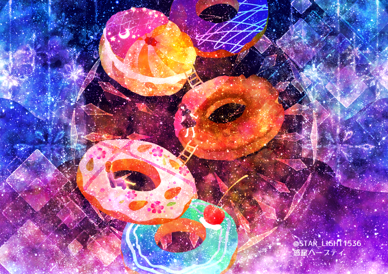 2girls black_dress black_hair brown_hair cherry chocolate_icing cream donut dress food food_focus fruit icing ladder multiple_girls on_food original pastry purple_dress sitting star_(symbol) star_symbol_background wakusei_habuti
