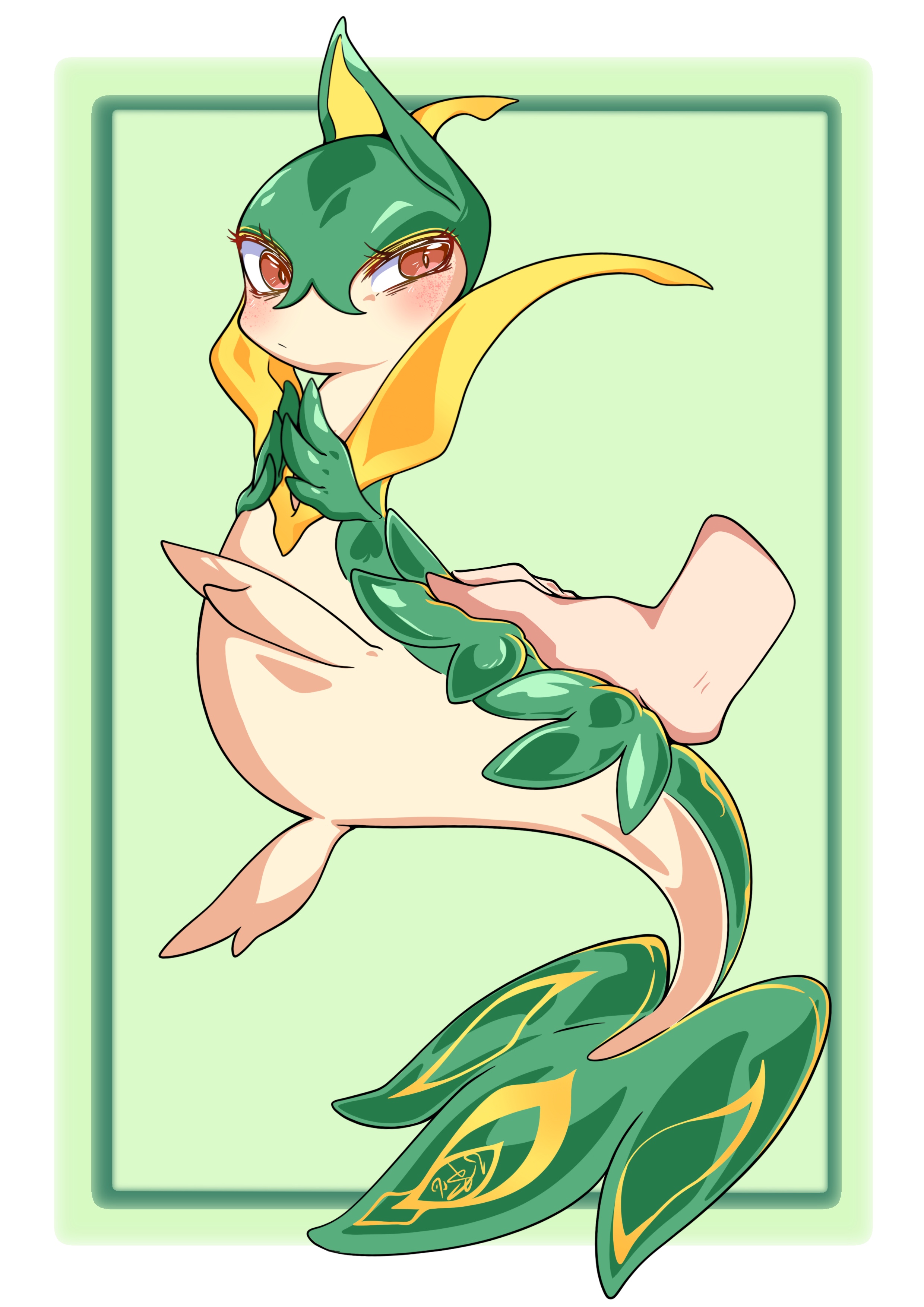 :/ absurdres blush border closed_mouth disembodied_hand eyelashes freckles from_side full_body gen_5_pokemon green_background hand_on_another's_back hands_up highres leg_up looking_back mikesi_quan nintendo outside_border own_hands_together pokemon pokemon_(creature) red_eyes servine sideways_mouth simple_background solo_focus steepled_fingers white_border