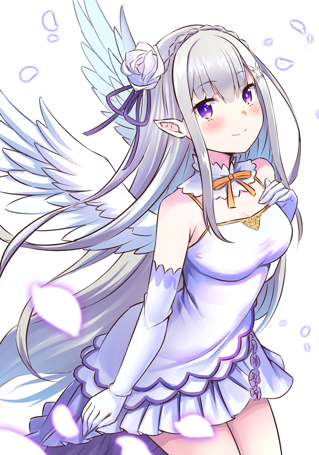 1girl angel angel_wings bare_shoulders blush braid breasts cowboy_shot crown_braid dress elbow_gloves elf emilia_(re:zero) falling_feathers feathered_wings feathers flower gloves hair_flower hair_ornament hair_ribbon hand_on_own_chest long_hair looking_at_viewer medium_breasts pointy_ears purple_eyes purple_ribbon re:zero_kara_hajimeru_isekai_seikatsu ribbon rose s_(hdru2332) smile solo white_background white_dress white_flower white_gloves white_hair white_rose white_wings wings x_hair_ornament