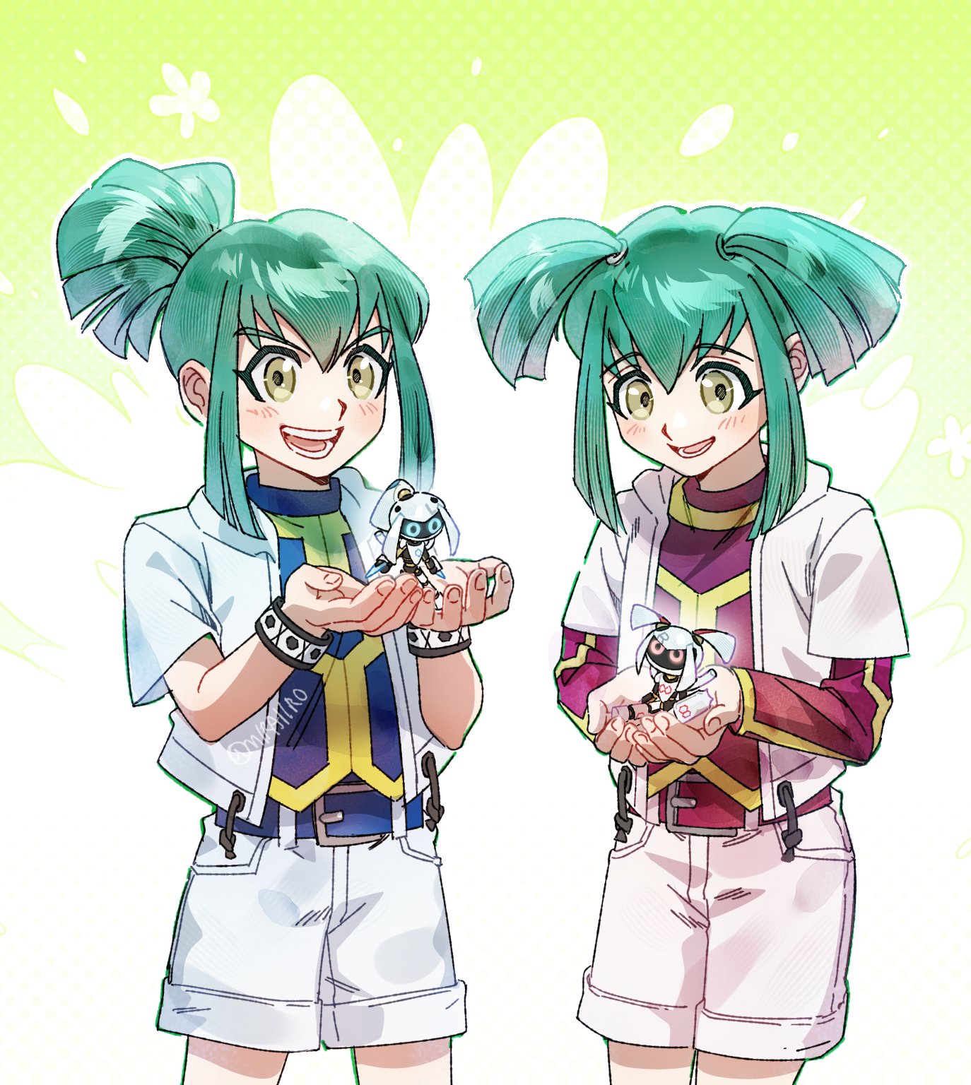 1boy 1girl blue_jacket blue_shirt blue_shorts blush brother_and_sister duel_monster green_eyes grey_hair high_ponytail highres hood hood_down hooded_jacket jacket lua_(yu-gi-oh!) luca_(yu-gi-oh!) medium_hair miraiir0 morphtronic_earfon pink_jacket pink_shorts ponytail red_shirt shirt shorts siblings twins twitter_username yu-gi-oh! yu-gi-oh!_5d's