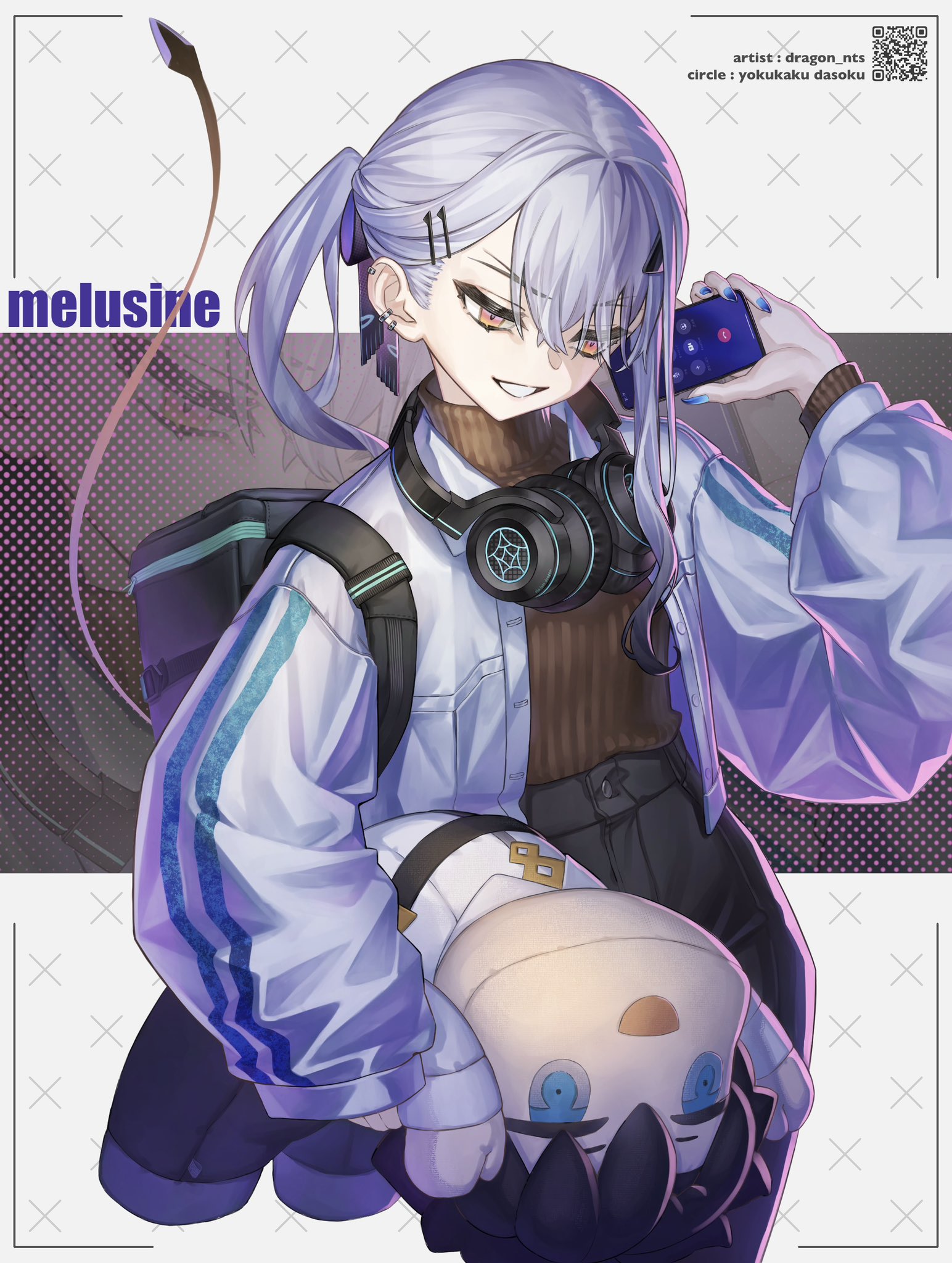 1girl artist_name black_pants blue_eyes blue_nails brown_shirt cellphone chaldea_logo chaldea_uniform character_doll doll dragon_girl dragon_nts dragon_tail fate/grand_order fate_(series) fujimaru_ritsuka_(male) headphones highres jacket melusine_(fate) open_clothes open_jacket open_mouth pants phone qr_code shirt smartphone smile stuffed_toy sweater tail turtleneck turtleneck_sweater white_jacket