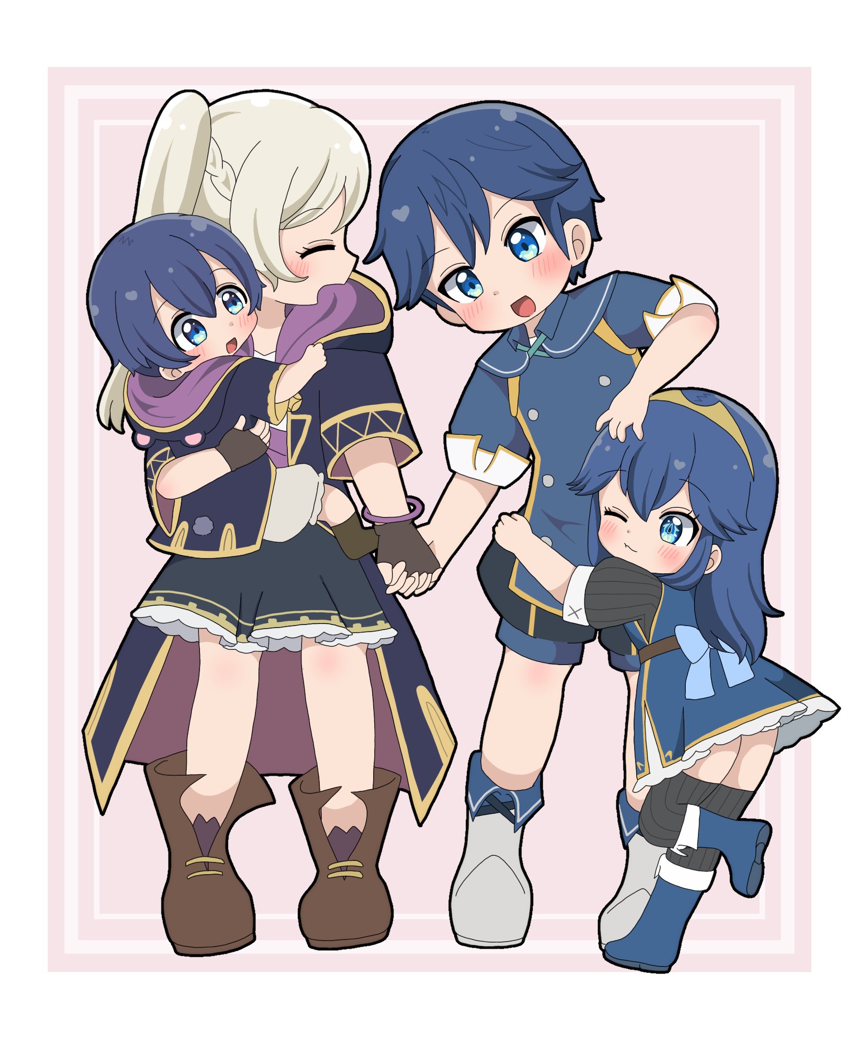 aged_down black_coat blue_dress blue_eyes blue_footwear blue_hair blue_shirt blush brand_of_the_exalt brown_footwear brown_gloves carrying carrying_person chrom_(fire_emblem) chrom_(young)_(fire_emblem) coat dress family father_and_child father_and_daughter father_and_son female_robin_(fire_emblem) female_robin_(young)_(fire_emblem) fingerless_gloves fire_emblem fire_emblem_awakening fire_emblem_heroes full_body gloves highres holding_hands leg_up long_hair lucina_(fire_emblem) male_morgan_(fire_emblem) mother_and_child mother_and_daughter mother_and_son nintendo one_eye_closed parent_and_child rukinya_nya shirt short_hair symbol_in_eye tiara white_footwear white_hair