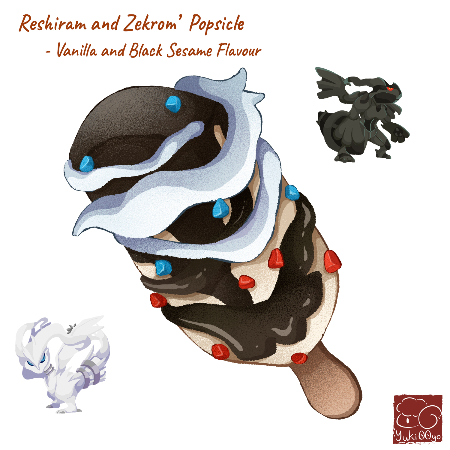 artist_logo artist_name character-themed_food character_name english_text food food_focus food_name gen_5_pokemon highres legendary_pokemon logo nintendo no_humans pokemon popsicle reshiram simple_background white_background yuki00yo zekrom