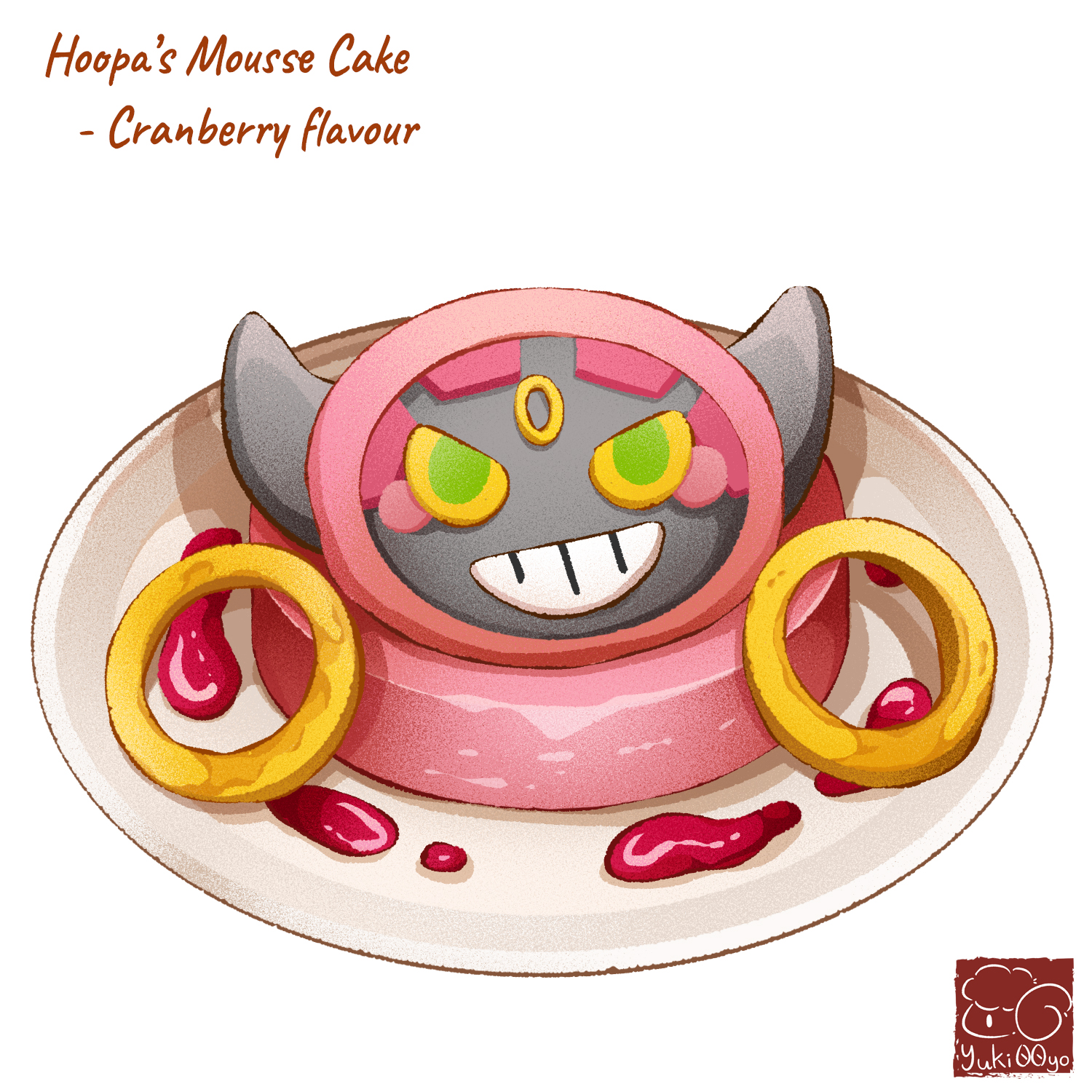 artist_logo artist_name cake character-themed_food character_name english_text food food_focus food_name gen_6_pokemon highres hoopa legendary_pokemon logo mousse_(food) mythical_pokemon nintendo no_humans plate pokemon simple_background syrup white_background yuki00yo