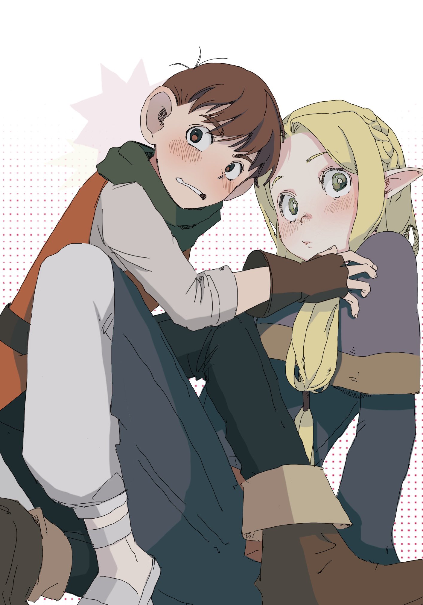 1boy 1girl blonde_hair blue_capelet blue_robe blush boots brown_eyes brown_footwear brown_gloves brown_hair capelet chilchuck_tims clenched_teeth dungeon_meshi fingerless_gloves gloves green_eyes hetero highres long_hair long_sleeves looking_at_viewer marcille_donato pants pointy_ears robe senawxoxo03 shoes simple_background teeth