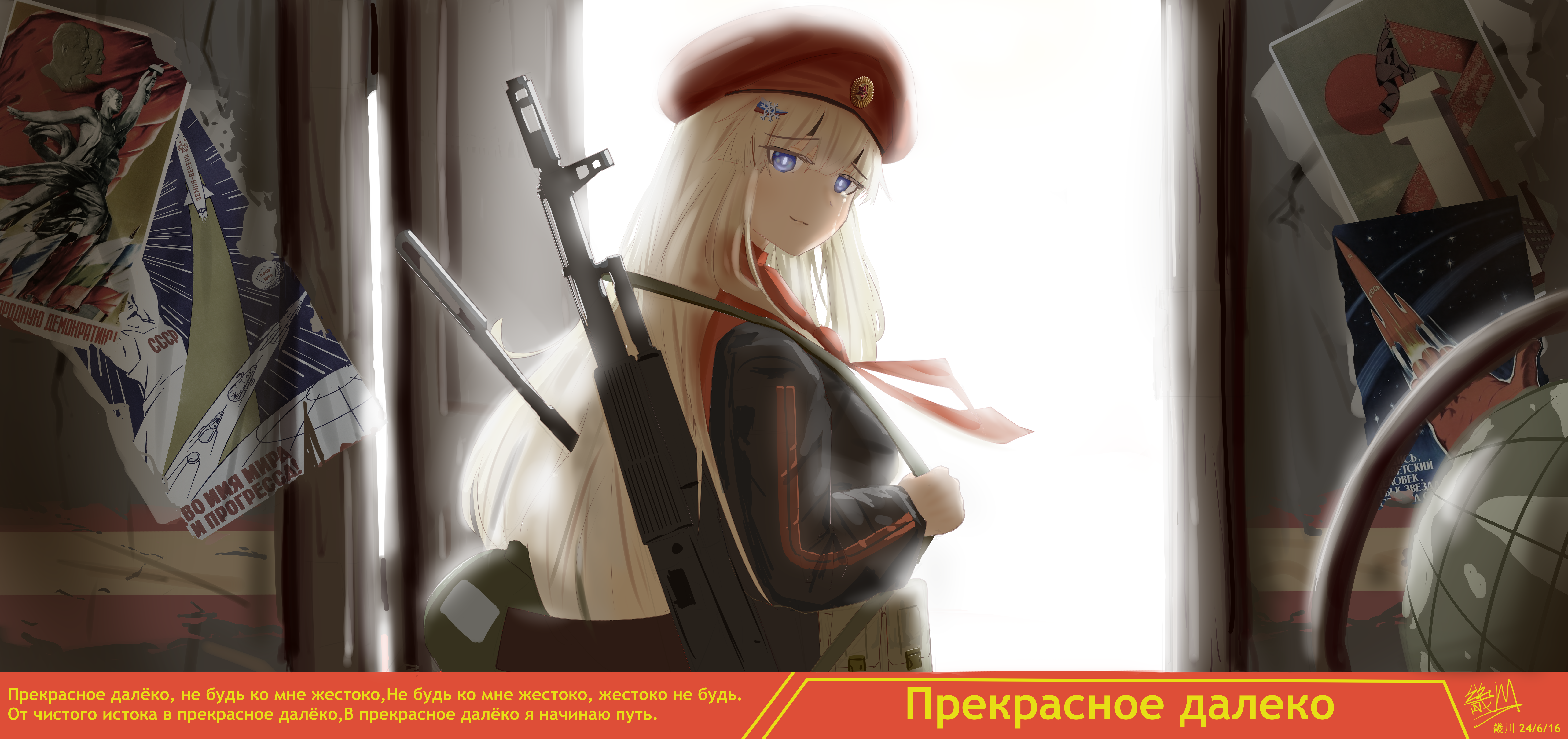 1girl absurdres ak-74m ak74m_(girls'_frontline) alternate_costume artist_name assault_rifle beret black_jacket blue_eyes chinese_commentary closed_mouth dated door doorway flag_hair_ornament girls'_frontline globe gun gun_sling hair_ornament hat highres jacket kalashnikov_rifle long_hair looking_at_viewer miliki mixed-language_commentary neckerchief poster_(object) red_neckerchief rifle russian_commentary russian_flag russian_text snowflake_hair_ornament solo tears upper_body weapon white_hair